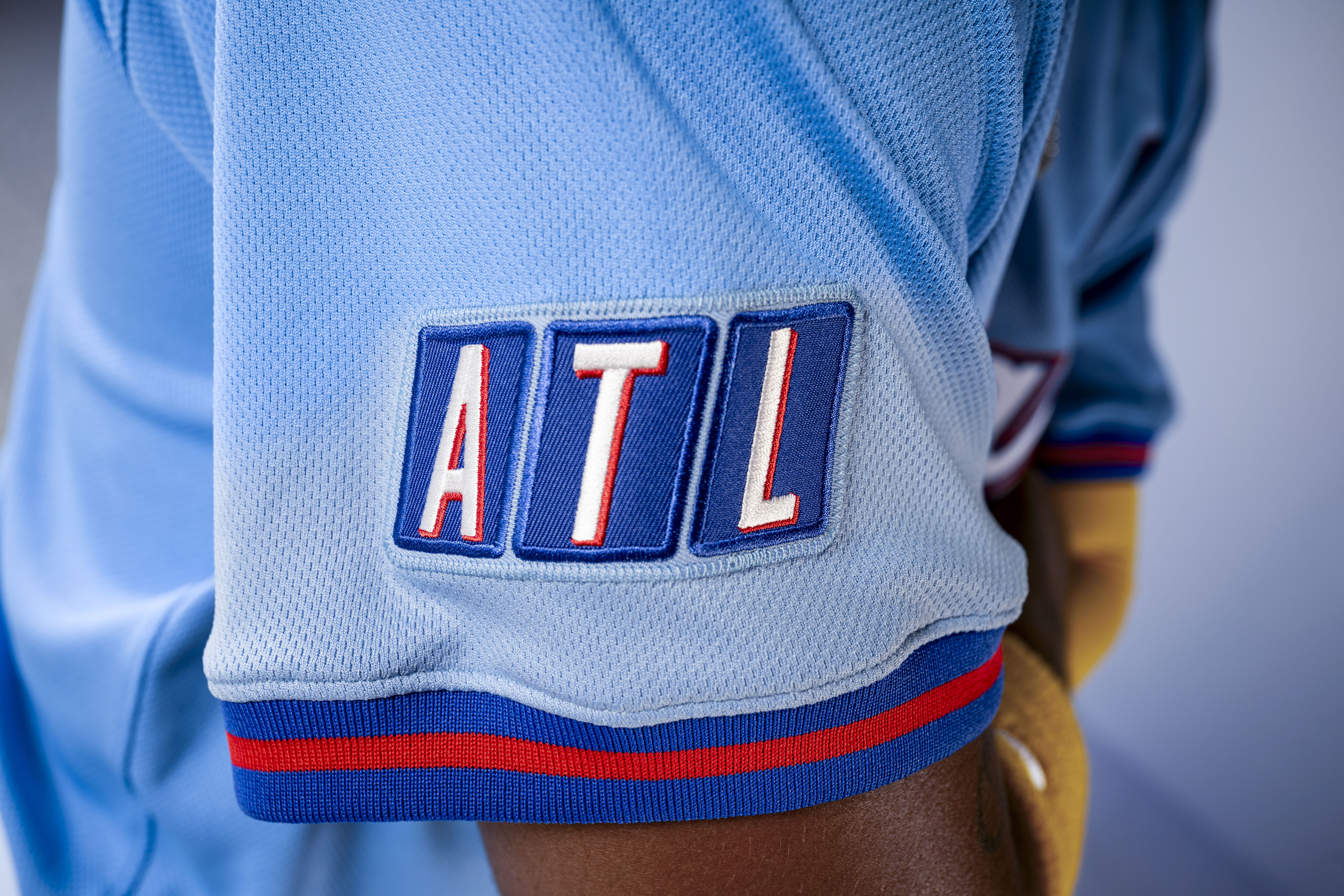 The new jersey’s primary color is a brighter version of the powder blue uniforms worn during the 1980s. A modern look is also created by an updated “Atlanta” script log and the inclusion of red piping alongside the blues throughout the uniform.