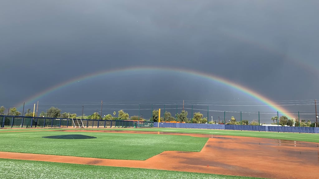 Before leaving, Counsell snapped a couple of photos looking across one of the Brewers’ practice fields. The infield is under water. The green grass is covered in white hail. And a full rainbow stretches across a jet-black sky.