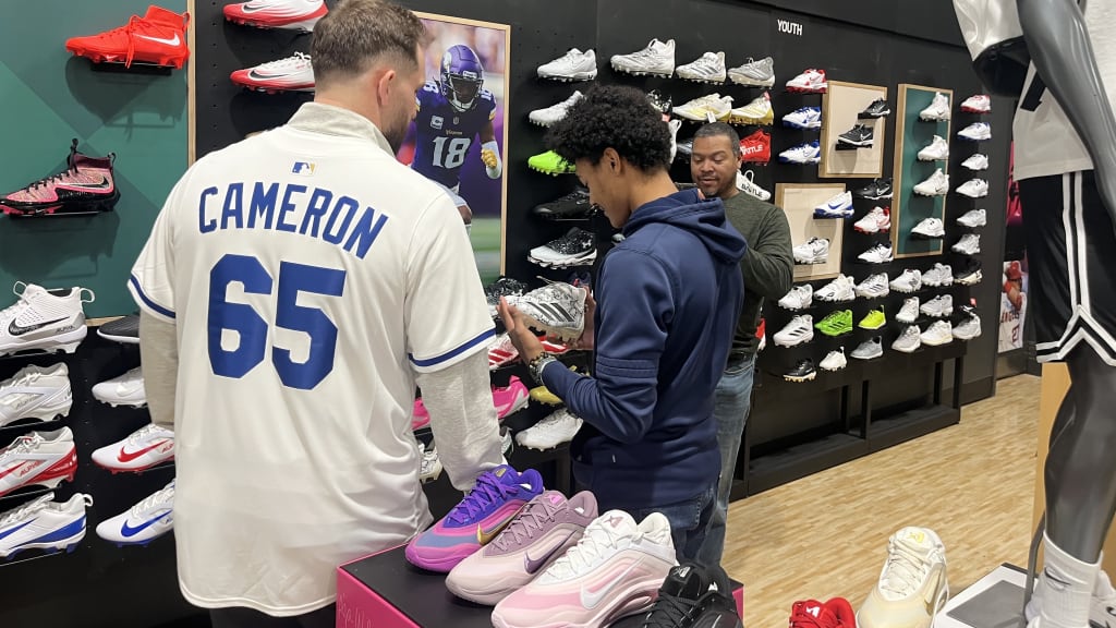 At first, the group was silent, not quite believing what they just heard. Then, smiles, laughter and joy spread around the room. Once the gift cards were distributed, the group dispersed around the store. The baseball section was, predictably, popular, and Jensen helped a few pick out new bats. Shoes were next up, and both Jensen and Cameron offered advice on style and practicality. Jensen pointed out the cleats he had on when he recorded his first Major League hit this past season. One of the boys listening quickly asked an employee if they had his size.