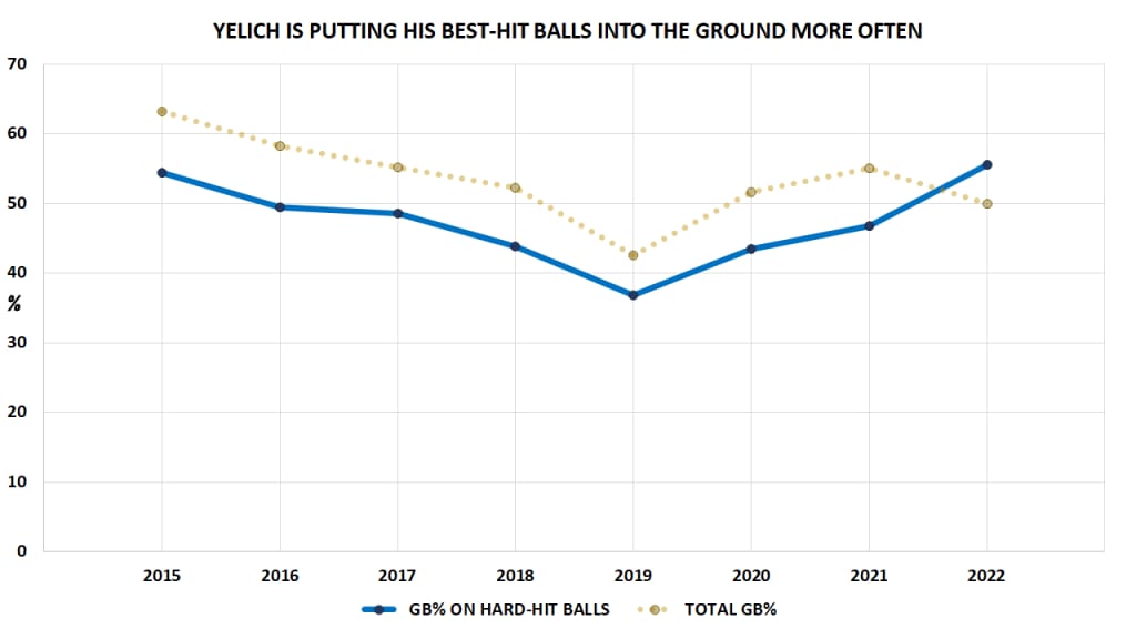 \n","providerName":"Twitter","providerUrl":"https://twitter.com","thumbnail_url":null,"type":"oembed","width":550,"contentType":"rich"},{"__typename":"Markdown","content":"Nor has Yelich himself been terribly forthcoming in his process. “It's a constant work in progress,” he told MLB.com’s Adam McCalvy on Monday night. “You're just trying to be as consistent as you can. There's good days and there's bad days but like I told you in Spring Training, it's a long year.”\n\nSince no one’s identified a swing difference, perhaps it’s about approach, where Yelich has become noticeably more passive.\n\nAfter swinging at about 45% of pitches in his big 2018-19 years, that’s down to just 35% this year – despite pitchers challenging him in the zone _more_ often. That’s one of the [1](https://www.fangraphs.com/leaders.aspx?pos=all&stats=bat&lg=all&qual=y&type=22&season=2022&month=0&season1=2022&ind=0&team=0&rost=0&age=0&filter=&players=0&startdate=2022-01-01&enddate=2022-12-31&sort=6,a)0 lowest swing rates in the game, and only a dozen hitters are swinging in the zone less often than he is.\n\nIn 2018, he hit a dozen homers on the first pitch. In 2022, he’s only even _offered_ at the first pitch four times. Or, to put it another way, look at his swing rate and slugging rate early in the count, when it’s 0-0, 1-0, or 0-1.","type":"text"},{"__typename":"Markdown","content":"**2018-’19 on early counts** \n35% swings \n38 home runs, .960 SLG","type":"text"},{"__typename":"Markdown","content":"**2020-’22 on early counts** \n27% swings \n8 home runs, .636 SLG","type":"text"},{"__typename":"Markdown","content":"If Yelich has answers to what’s causing all the grounders, he doesn’t seem interested in sharing them, as he told McCalvy in March.\n\n\"It's not \\[a\\] conscious effort to do that,” Yelich said. “It's just what happens. If you hit ground balls in the big leagues, it's just not going to go well for you. There were just a lot of things that were going on. You can understand what's happening, but being able to fix it and stop it, is a whole other thing. It's hard to really explain. It wasn't anything that I was consciously trying to do or \\[former hitting coaches\\] Andy \\[Haines\\] or \\[Jacob\\] Cruz was making me do. It's just baseball sometimes. Sometimes, it's hard.”\n\nNo kidding. Nearly as hard, it seems, as trying to explain the ups and downs of Yelich’s ever-changing career. The signs are positive, if you want them to be. You don't hit the ball this hard if you're completely out of sync; you aren't this selective at the plate if your eye is gone; no one in baseball has increased their barrel rate as much as he has. It just all seems like it hasn't quite come together yet. It all seems, however, like it could quite quickly.","type":"text"}],"relativeSiteUrl":"/news/christian-yelich-signs-of-improvement","contentType":"news","subHeadline":"Brewers outfielder leads Majors in hard-hit rate","summary":"If this is the third act of Christian Yelich’s otherwise outstanding career, consider it easily the most confounding one.\nFirst, there was the doubles-machine young Marlin, the one who hit the ball hard but never off the ground enough to truly take advantage of all that power – yet managed","tagline({\"formatString\":\"none\"})":null,"tags":[{"__typename":"InternalTag","slug":"storytype-article","title":"Article","type":"article"},{"__typename":"ContributorTag","slug":"mike-petriello","title":"Mike Petriello","type":"contributor"},{"__typename":"TeamTag","slug":"teamid-158","type":"team","title":"Milwaukee Brewers","team":{"__ref":"Team:158"}},{"__typename":"PersonTag","slug":"playerid-592885","title":"Christian Yelich","person":{"__ref":"Person:592885"},"type":"player"},{"__typename":"TaxonomyTag","slug":"player-tracking","title":"Statcast","type":"taxonomy"},{"__typename":"TaxonomyTag","slug":"apple-news","title":"Apple News","type":"taxonomy"},{"__typename":"TaxonomyTag","slug":"group-2","title":"group 2 - Draft Kings","type":"taxonomy"}],"type":"story","thumbnail":"https://img.mlbstatic.com/mlb-images/image/private/{formatInstructions}/mlb/gnpxamtetz6xo6so8jja","title":"Christian Yelich showing signs of improvement"},"getTeamsBySportId({\"ids\":[1]})":[{"__ref":"Team:133"},{"__ref":"Team:134"},{"__ref":"Team:135"},{"__ref":"Team:136"},{"__ref":"Team:137"},{"__ref":"Team:138"},{"__ref":"Team:139"},{"__ref":"Team:140"},{"__ref":"Team:141"},{"__ref":"Team:142"},{"__ref":"Team:143"},{"__ref":"Team:144"},{"__ref":"Team:145"},{"__ref":"Team:146"},{"__ref":"Team:147"},{"__ref":"Team:158"},{"__ref":"Team:108"},{"__ref":"Team:109"},{"__ref":"Team:110"},{"__ref":"Team:111"},{"__ref":"Team:112"},{"__ref":"Team:113"},{"__ref":"Team:114"},{"__ref":"Team:115"},{"__ref":"Team:116"},{"__ref":"Team:117"},{"__ref":"Team:118"},{"__ref":"Team:119"},{"__ref":"Team:120"},{"__ref":"Team:121"}],"getHeaderFromForgePath({\"contentSource\":\"MLB\",\"headerPath\":\"/_navs/header/mlb/global-nav\",\"locale\":\"en-US\",\"paletteKey\":\"mlb-base-palette\",\"propertiesKey\":\"mlb-global-properties\"})":{"__typename":"Header","navigation":[{"__typename":"NavItem","customPropertiesString":"align:right;","icon":null,"linkTarget":null,"linkText":"MLB.TV","linkUrl":"https://www.mlb.com/tv?&affiliateId=mlbMENUtv","placement":"right","visible":"true","subNav":[{"__typename":"SubnavColumn","title":null,"navigation":[{"__typename":"NavItem","placement":null,"linkText":"Buy MLB.TV","linkUrl":"/live-stream-games/subscribe?&affiliateId=mlbMENUtv","linkTarget":null,"visible":"true","icon":null,"tooltip":null,"customPropertiesString":null},{"__typename":"NavItem","placement":null,"linkText":"Buy At Bat","linkUrl":"/live-stream-games/subscribe/at-bat?&affiliateId=mlbMENUtv","linkTarget":null,"visible":null,"icon":null,"tooltip":null,"customPropertiesString":null},{"__typename":"NavItem","placement":null,"linkText":"Buy MLB Network","linkUrl":"/live-stream-games/subscribe/mlbnetwork?&affiliateId=m