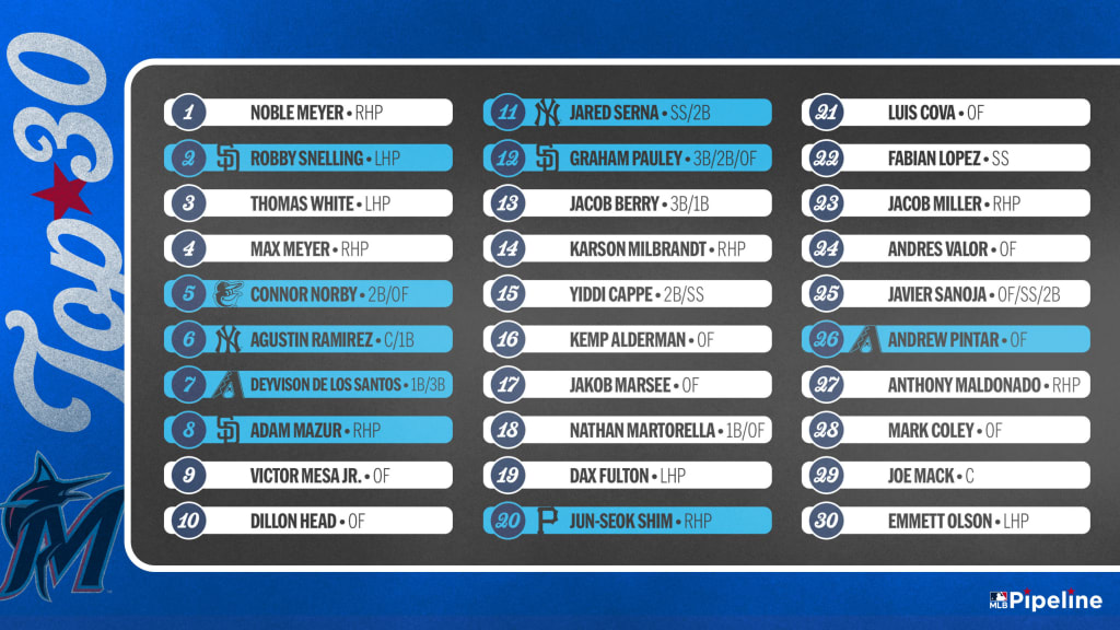 “I've had 12 players pushed off the Marlins list this year by trades. ... They have had three different guys on the current list take over as the top position prospect within less than a week. You had Deyvison De Los Santos take over the top position prospect spot after he came over in the A.J. Puk trade, then he was supplanted by Agustin Ramirez, who came over in the Jazz Chisholm Jr. trade. Then they got Connor Norby in the Trevor Rogers trade.
