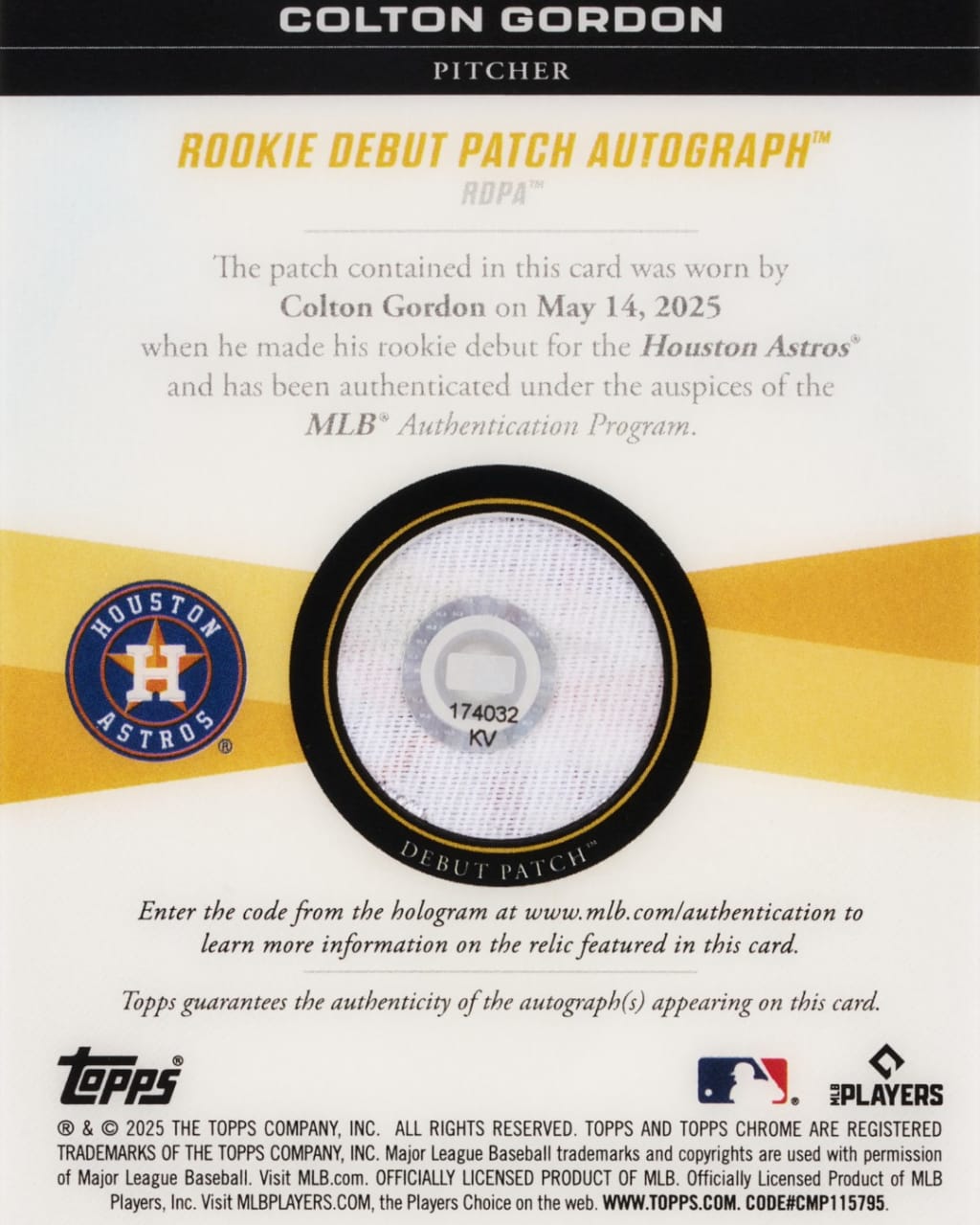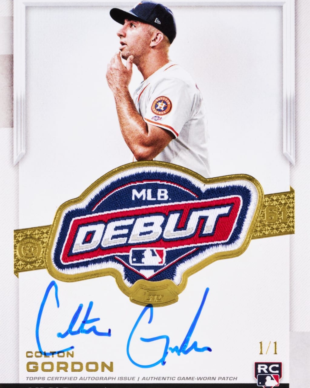 Gordon kept the jersey he wore during his Major League debut, sans the patch. He also has the baseball from his first career strikeout, against Jonathan India, and the lineup card from Houston’s 4-3 win. The patch would round out a nice collection from his debut game.