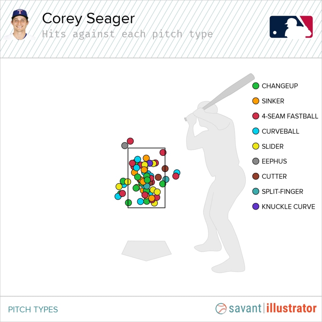 You can break this down even further against specific pitch types and see that opposing pitchers basically have no pitch they can throw against Seager. Against the six pitch types Seager has seen at least 50 pitches against, he's been downright awesome.
