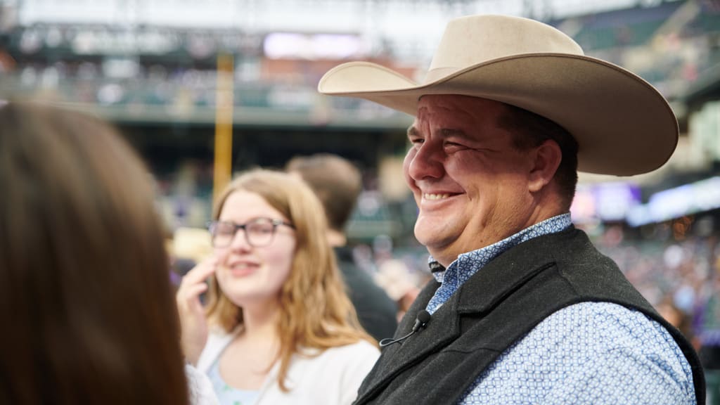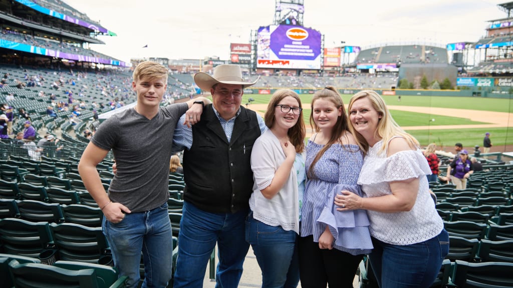 The Brashear family was at the game Sunday night. ESPN was there too for a clash between the Colorado Rockies and the Los Angeles Dodgers. Before the game, Mike and his family got to hang out on the field, shake hands with Rockies pitcher Yency Almonte, and stand, cowboy hat over his heart, for the playing of the national anthem.