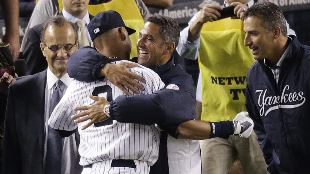Then you looked over in front of the Yankees' dugout and -- as if by magic -- Joe Torre was there, and Mariano Rivera, and Andy Pettitte and Bernie Williams and Jorge Posada. Jeter went over to them. Before long, he was headed out to shortstop, kneeling down there as the cheers kept coming from everywhere. Mostly the past.