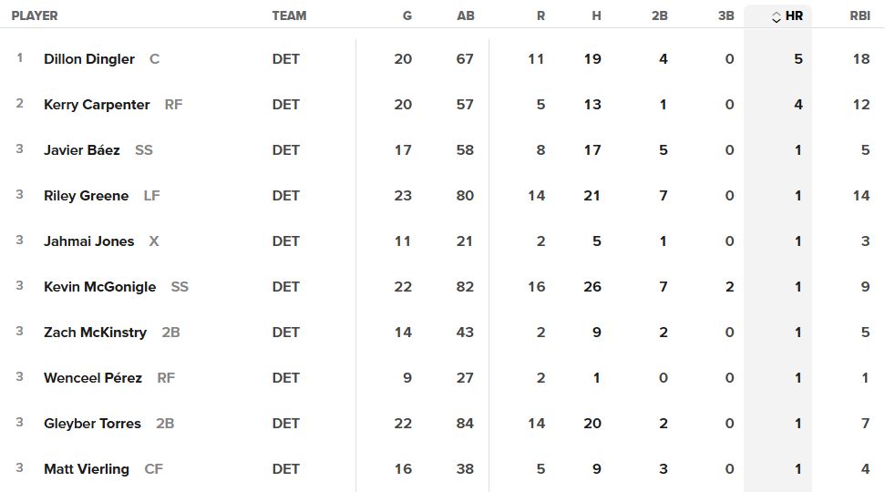 The Tigers have been starved for power, hitting just 17 home runs through 23 games. Dingler, though, has been mashing, recording a team-leading five dingers. is the only other Tigers hitter with multiple homers.