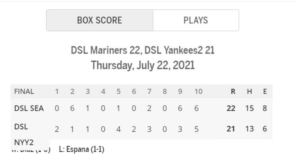 Imagine no more, because that's what the box score looked like after one of the wildest baseball games on record -- the Dominican Summer League Mariners defeated the DSL Yankees, 22-21, in 10 innings on Thursday night, and it was as crazy as it sounds.