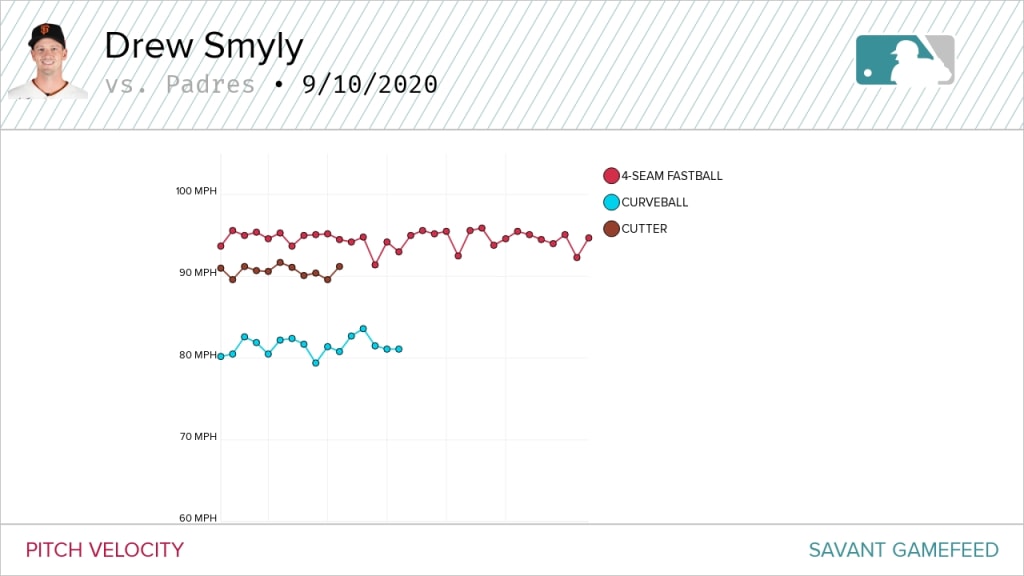 \n","providerName":"Twitter","providerUrl":"https://twitter.com","thumbnail_url":null,"type":"oembed","width":550,"contentType":"rich"},{"__typename":"Markdown","content":"Exactly how long Smyly remains a reliever is to be determined. He was activated off the injured list before Thursday’s game after missing almost six weeks because of a left index finger strain. He needs to be able to pitch multiple innings, so a role in the bullpen seems like a logical landing spot until he can stretch out his pitch count. He also hasn’t pitched more than four innings in an outing this season.\n\nBut it’s worth noting that Smyly showed good command Thursday, with a fastball that topped out at 95.9 mph and an effective curveball that generated five whiffs on the six swings against it. He also has 108 career starts on his résumé and he’s finally back at full strength after missing the 2017-18 seasons while rehabbing from Tommy John surgery.","type":"text"},{"__typename":"Image","caption":null,"contextualCaption":null,"contextualAspectRatio":null,"credit":null,"contentType":"Photography","format":"jpg","templateUrl":"https://img.mlbstatic.com/mlb-images/image/private/{formatInstructions}/mlb/jmhmvcyzxvjudqvnbw3o","type":"image"},{"__typename":"Markdown","content":"Also, San Francisco -- like every contending club -- could use more depth in its rotation. Giants starters are 9-11 with a 4.91 ERA, which ranks 19th in MLB.\n\nWill the Giants be tempted to insert Smyly into the rotation, especially with the club holding onto the eighth and final spot in the National League postseason standings with a 23-22 record, just behind the Marlins (20-19) by a few percentage points? Does Smyly need to pitch at least five innings of relief in an outing before the club starts him?","type":"text"},{"__typename":"Video","contentDate":"2020-09-11T05:29:54.544Z","preferredPlaybackScenarioURL({\"preferredPlaybacks\":\"mp4AvcPlayback\"})":"https://mlb-cuts-diamond.mlb.com/FORGE/2020/2020-09/10/e3c91483-4a5b78dc-bfe7b327-csvm-diamondx64-asset_1280x720_59_4000K.mp4","type":"video","description":"Giants manager Gabe Kapler discusses how Drew Smyly was able to keep the Giants in the game with his relief performance","displayAsVideoGif":false,"duration":"00:00:48","slug":"gabe-kapler-on-drew-smyly","tags":[{"__typename":"GameTag"},{"__typename":"TeamTag","slug":"teamid-137","title":"San Francisco Giants","team":{"__ref":"Team:137"},"type":"team"},{"__typename":"TaxonomyTag","slug":"manager-postgame","title":"manager postgame","type":"taxonomy"},{"__typename":"TaxonomyTag","slug":"send-to-news-mlb-feed","title":"Send To News MLB feed","type":"taxonomy"}],"thumbnail":{"__typename":"Thumbnail","templateUrl":"https://img.mlbstatic.com/mlb-images/image/private/{formatInstructions}/mlb/iywnyziicfnoy1ookbic"},"title":"Gabe Kapler on Drew Smyly","relativeSiteUrl":"/video/gabe-kapler-on-drew-smyly"},{"__typename":"Markdown","content":"Those are among the many questions that remain, and they likely won’t be answered -- at least publicly -- ahead of time. The Giants are one of the few teams that do not publicize their probable starters several days in advance.\n\n“We have looked at some different scenarios and ways to lay out a rotation going forward,” Kapler said. “We'll continue to consider what best way to get the best out of every starter given their rest and their workload, but also to line up our best guys potentially.”\n\nAs for Cahill, he gave up a pair of hits to Trent Grisham and Fernando Tatis Jr. to start the bottom of the first. Both scored on a double by Mitch Moreland, who then trotted home on a double by Austin Nola to push San Diego’s lead to 3-0.","type":"text"},{"__typename":"Video","contentDate":"2020-09-11T01:39:21.856Z","preferredPlaybackScenarioURL({\"preferredPlaybacks\":\"mp4AvcPlayback\"})":"https://mlb-cuts-diamond.mlb.com/FORGE/2020/2020-09/10/1940e9bc-7994299c-d58aab82-csvm-diamondx64-asset_1280x720_59_4000K.mp4","type":"video","description":"Wilmer Flores belts a solo home run to left-center field, cutting the Giants' deficit to 3-1 in the top of the 2nd inning","displayAsVideoGif":false,"duration":"00:00:33","slug":"wilmer-flores-homers-9-on-a-fly-ball-to-left-center-field","tags":[{"__typename":"InternalTag","slug":"season-2020","title":"Season 2020","type":"season"},{"__typename":"GameTag"},{"__typename":"PersonTag","slug":"playerid-527038","title":"Wilmer Flores","person":{"__ref":"Person:527038"},"type":"player"},{"__typename":"TeamTag","slug":"teamid-137","title":"San Francisco Giants","team":{"__ref":"Team:137"},"type":"team"},{"__typename":"TaxonomyTag","slug":"hitting","title":"hitting","type":"taxonomy"},{"__typename":"TaxonomyTag","slug":"highlight","title":"highlight","type":"taxonomy"},{"__typename":"TaxonomyTag","slug":"in-game-highlight","title":"in-game highlight","type":"taxonomy"},{"__typename":"TaxonomyTag","slug":"home-run","title":"home run","type":"taxonomy"},{"__typename":"TaxonomyTag","slug":"2-yahoo-mlb-ads-feed","title":"2-Yahoo MLB Ads Feed","type":"taxonomy"},{"__typename":"TaxonomyTag","slug":"yahoo-in-game","title":"Yahoo In-Game","type":"taxonomy"},{"__typename":"TaxonomyTag","slug":"send-to-news-mlb-feed","title":"Send To News MLB feed","type":"taxonomy"},{"__typename":"TaxonomyTag","slug":"international-feed","title":"International Partner feed","type":"taxonomy"},{"__typename":"TaxonomyTag","slug":"eclat-feed","title":"Eclat feed","type":"taxonomy"},{"__typename":"TaxonomyTag","slug":"yahoo-fantasy","title":"Yahoo Fantasy","type":"taxonomy"},{"__typename":"TaxonomyTag","slug":"1-yahoo-fantasy-feed","title":"1-Yahoo Fantasy Feed","type":"taxonomy"}],"thumbnail":{"__typename":"Thumbnail","templateUrl":"https://img.mlbstatic.com/mlb-images/image/private/{formatInstructions}/mlb/bm43glrx5rq4grczcgmr"},"title":"Wilmer Flores' solo home run","relativeSiteUrl":"/video/wilmer-flores-homers-9-on-a-fly-ball-to-left-center-field"},{"__typename":"Markdown","content":"Wil