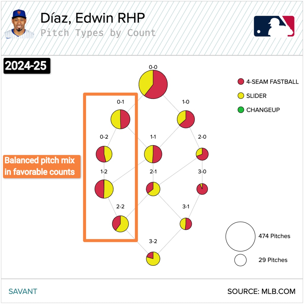 \n\n","providerName":"Twitter","providerUrl":"https://twitter.com","thumbnail_url":null,"type":"oembed","width":550,"contentType":"rich"},{"__typename":"Markdown","content":"For a lot of those closers, one of their two pitches does the heavy listing. Take Devin Williams, for example, who just signed with the Mets. Essentially every pitch Williams throws is a fastball or changeup. But his \"airbender\" changeup has been by far his most dominant pitch over the course of his career.\n\nThat was Díaz for a while, too.\n\nWhen he turned things around with the Mets after his rocky first season in New York, it was because of his slider. Díaz has a 100 mph fastball, but his slider was by far his best pitch by the numbers. From 2020-22, when Díaz had a 2.27 ERA and 15.4 strikeouts per nine innings for the Mets, his slider was generating way, way more value than his four-seamer.\n\nBut over the last two seasons, since Díaz returned from the torn patellar tendon that cost him all of 2023, the scales have shifted.\n\nHe is still an elite closer -- Díaz has a 2.48 ERA and 13.7 K/9 since 2024. His slider is still a devastating wipeout pitch. But his fastball has stepped up to meet the slider.","type":"text"},{"__typename":"Video","contentDate":"2025-05-17T20:08:17.652Z","preferredPlaybackScenarioURL({\"preferredPlaybacks\":\"mp4AvcPlayback\"})":"https://mlb-cuts-diamond.mlb.com/FORGE/2025/2025-05/17/daa46138-54de6ea7-c1e5a9d8-csvm-diamondgcp-asset_1280x720_59_4000K.mp4","type":"video","description":"Edwin Díaz rings up Aaron Judge on a fastball for the final out of the game as the Mets defeat the Yankees, 3-2","displayAsVideoGif":false,"duration":"00:00:27","slug":"aaron-judge-strikes-out-swinging-bgaysg","tags":[{"__typename":"InternalTag","slug":"season-2025","title":"Season 2025","type":"season"},{"__typename":"GameTag"},{"__typename":"PersonTag","slug":"playerid-621242","title":"Edwin Diaz","person":{"__ref":"Person:621242"},"type":"player"},{"__typename":"TeamTag","slug":"teamid-121","title":"New York Mets","team":{"__ref":"Team:121"},"type":"team"},{"__typename":"TaxonomyTag","slug":"pitching","title":"pitching","type":"taxonomy"},{"__typename":"TaxonomyTag","slug":"highlight","title":"highlight","type":"taxonomy"},{"__typename":"TaxonomyTag","slug":"in-game-highlight","title":"in-game highlight","type":"taxonomy"},{"__typename":"TaxonomyTag","slug":"game-action-tracking","title":"game action tracking","type":"taxonomy"},{"__typename":"TaxonomyTag","slug":"vod","title":"vod","type":"taxonomy"},{"__typename":"TaxonomyTag","slug":"game-story-highlight","title":"Game story highlight","type":"taxonomy"},{"__typename":"TaxonomyTag","slug":"wow","title":"wow","type":"taxonomy"},{"__typename":"TaxonomyTag","slug":"eclat-feed","title":"Eclat feed","type":"taxonomy"},{"__typename":"TaxonomyTag","slug":"international-feed","title":"International Partner feed","type":"taxonomy"},{"__typename":"TaxonomyTag","slug":"fan-duel","title":"Fan Duel","type":"taxonomy"},{"__typename":"TaxonomyTag","slug":"imagen-feed","title":"Imagen feed","type":"taxonomy"},{"__typename":"TaxonomyTag","slug":"star-of-the-game","title":"Player of the Game","type":"taxonomy"}],"thumbnail":{"__typename":"Thumbnail","templateUrl":"https://img.mlbstatic.com/mlb-images/image/upload/{formatInstructions}/mlb/hbzljyrh6zhkheqbc5ie"},"title":"Edwin Díaz earns the save","relativeSiteUrl":"/video/aaron-judge-strikes-out-swinging-bgaysg"},{"__typename":"Markdown","content":"Statcast has a \"run value\" stat for pitchers, which looks at the result of every pitch thrown -- ball, strike, single, home run, strikeout, walk, and so on and so on -- and measures its impact on run prevention. A positive run value means more runs prevented for the pitcher; a negative run value means runs cost to his team.\n\nDíaz's pitching value used to come overwhelmingly from his slider. But now? Díaz's heater and his slider are now *equally* valuable.\n\n**Díaz from 2020-22**\n\n* **Slider:** +36 run value\n* **Fastball:** 0 run value\n\n**Díaz from 2024-25**\n\n* **Slider:** +12 run value\n* **Fastball:** +12 run value\n\nThat's a big swing. And it's not just that both pitches are equals now -- both are also still top-tier pitches. Díaz ranks right around the top 10 among MLB relievers in both the run value generated by his fastball and by his slider since 2024.","type":"text"},{"__typename":"Video","contentDate":"2024-10-19T00:47:17.539Z","preferredPlaybackScenarioURL({\"preferredPlaybacks\":\"mp4AvcPlayback\"})":"https://mlb-cuts-diamond.mlb.com/FORGE/2024/2024-10/18/7377bc43-a6772a1d-ab84580f-csvm-diamondgcp-asset_1280x720_59_4000K.mp4","type":"video","description":"Statcast measures the pitch velocity and horizontal break of the pitches from Edwin Díaz's strikeout of Shohei Ohtani in Game 5 of the NLCS","displayAsVideoGif":false,"duration":"00:00:40","slug":"diaz-strikes-out-ohtani-on-99-2-mph-fastball","tags":[{"__typename":"GameTag"},{"__typename":"TeamTag","slug":"teamid-121","title":"New York Mets","team":{"__ref":"Team:121"},"type":"team"},{"__typename":"PersonTag","slug":"playerid-621242","title":"Edwin Diaz","person":{"__ref":"Person:621242"},"type":"player"},{"__typename":"TaxonomyTag","slug":"vod","title":"vod","type":"taxonomy"},{"__typename":"TaxonomyTag","slug":"player-tracking","title":"Statcast","type":"taxonomy"},{"__typename":"TaxonomyTag","slug":"game-action-tracking","title":"game action tracking","type":"taxonomy"},{"__typename":"TaxonomyTag","slug":"alexa","title":"alexa","type":"taxonomy"},{"__typename":"TaxonomyTag","slug":"imagen-feed","title":"Imagen feed","type":"taxonomy"},{"__typename":"TaxonomyTag","slug":"postseason","title":"postseason","type":"taxonomy"}],"thumbnail":{"__typename":"Thumbnail","templateUrl":"https://img.mlbstatic.com/mlb-images/image/upload/{formatInstructions}/mlb/h0n5eap4mtuy6dqwxuj0"},"title":"Díaz strikes out Ohtani on 99.2 mph fastball","relativeSiteUrl":"/video/diaz-strikes-out-ohtani-on-99-2-mph