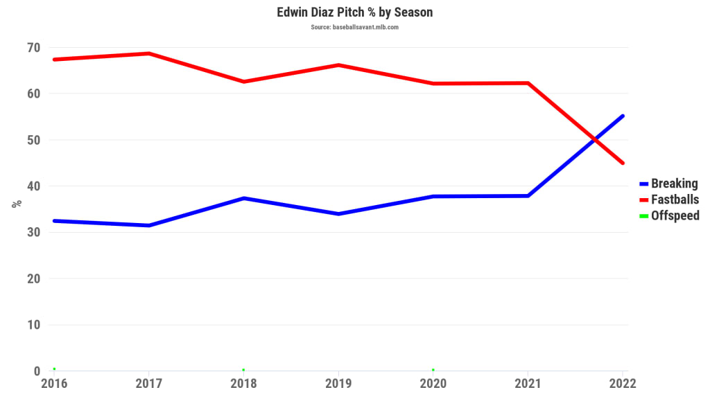 Díaz used to mimic deGrom in his pitch mix, predominantly attacking with four-seamers and throwing his slider off of that. In his first year with the Mets, when he gave up 15 homers and struggled, he was throwing two-thirds fastballs to one-third sliders. Even last year, he was still throwing 62% fastballs and 38% sliders, close to deGrom's 2021 usage of 57% four-seamers and 33% sliders.