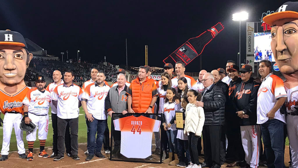 Erubiel Durazo had an emotional night Sunday as he witnessed the Naranjeros de Hermosillo retiring his No. 44 and putting it up in the rafters. Durazo was joined by the most important people in his life, such as family, friends and the fans who always supported him, as well as former teammates who made him feel as if he had hit a grand slam.