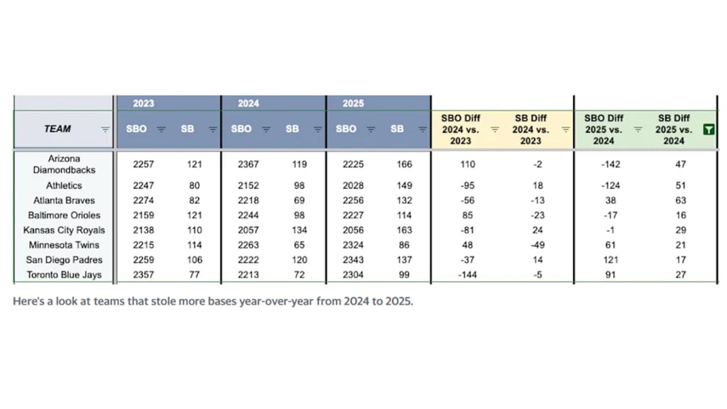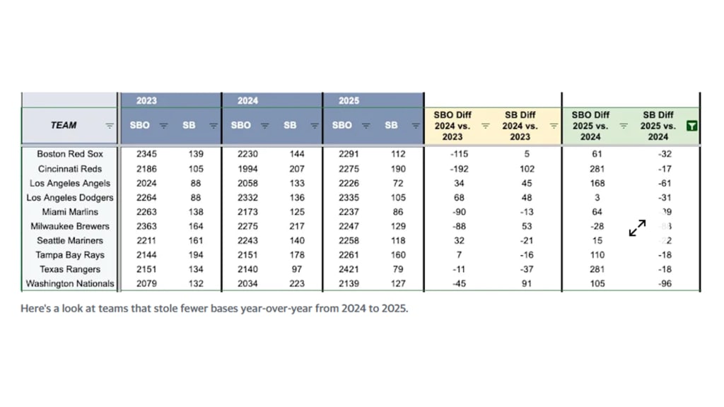 Meanwhile, 10 teams had their stolen bases totals dip 15 or more in 2025 compared to 2024. Six teams saw a decline of 30 or more stolen bases in 2025, including the Red Sox, Angels, Dodgers, Marlins, Brewers and Nationals. This is where context matters because the Brewers and Nationals had the two highest stolen bases totals in 2024, and saw those numbers take a huge hit in 2025. Meanwhile, the Marlins possibly had an outlier season in 2025, with 2024 being an unusual season for the Angels, regarding stolen bases.