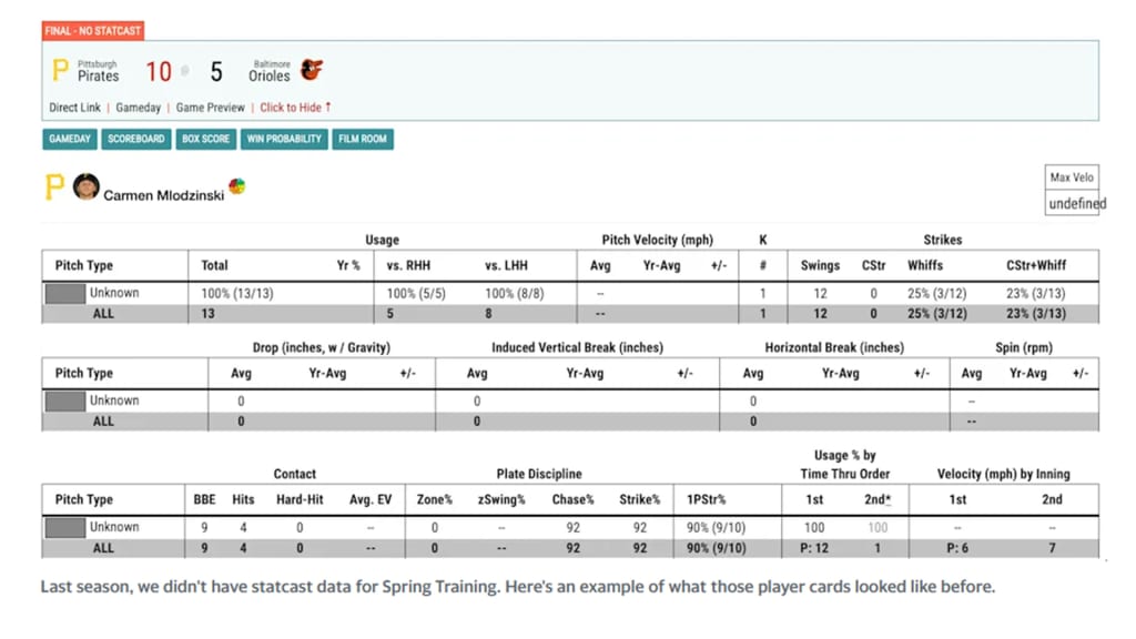 The visual below shows the Statcast Game Feed Player Breakdown Feature with no Statcast from last Spring Training.