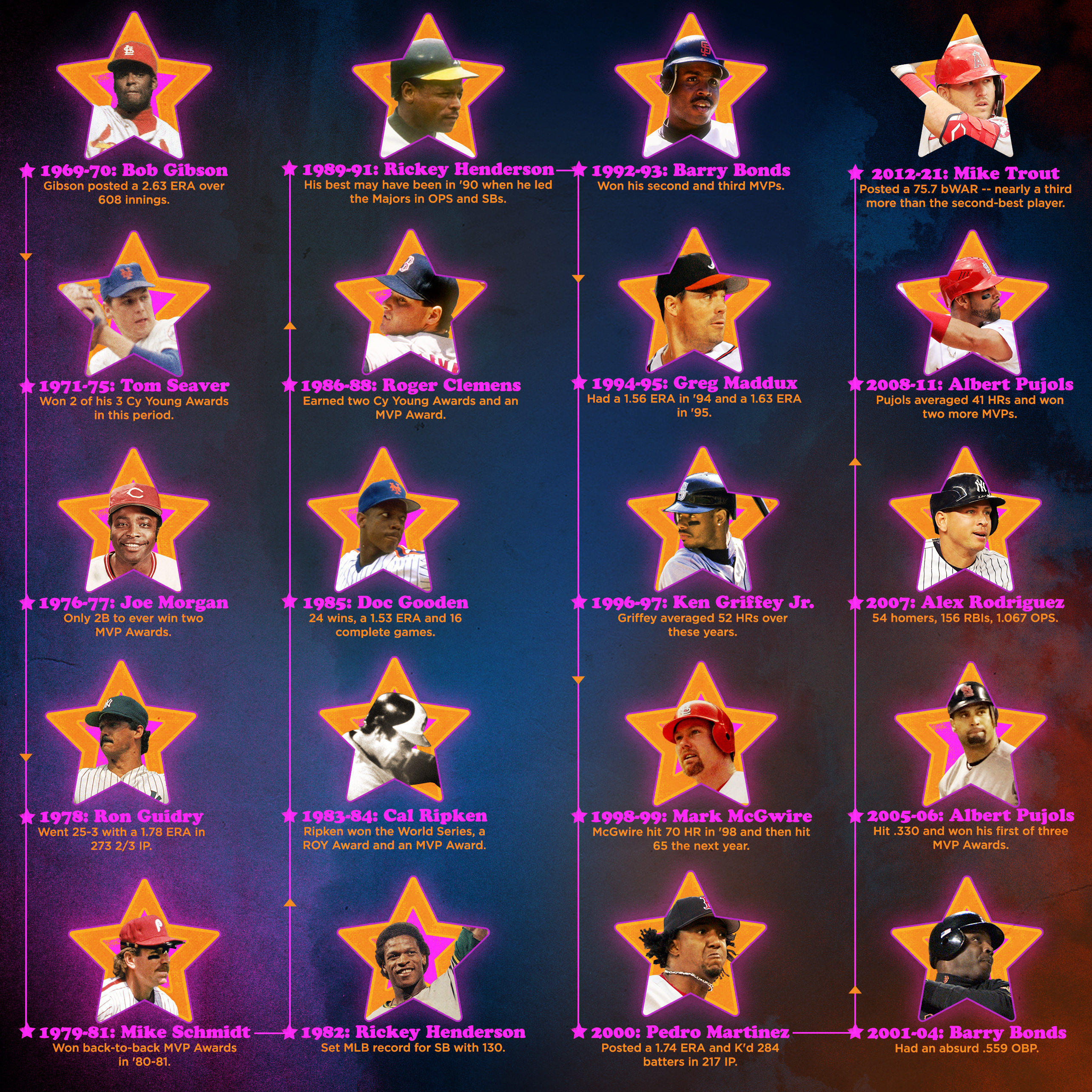 So, as an experiment today, I thought we’d come up with a theoretical holder of the mythical belt every year since 1969 — when the mound was lowered. The thing about the belt is, of course, like an actual championship belt, someone has to come take it from you. You can be the best player in baseball for a moment and not necessarily hold the belt; there have been a couple of players who have had better individual years (Mookie Betts, even Tatis or Shohei Ohtani this year) during Trout’s last decade, but none of them (so far) have been consistent enough to take it from him. That’s not to say there haven’t been one-year wonders who broke through. But on the whole: You have to forcibly take the belt, not have it handed to you.
