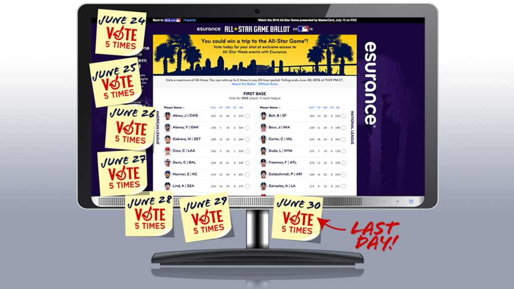 7. The Esurance MLB All-Star Game Final Vote will be your annual chance to select the final player on each league's All-Star roster. That balloting will conclude at 4 p.m. ET on Friday, July 8. Now in its 15th season with nearly 600 million votes cast, fans again will be able to make their Final Vote selections on MLB.com, club sites and mobile devices. Last year's Final Vote winners were Cardinals pitcher Carlos Martinez and Royals third baseman Mike Moustakas.