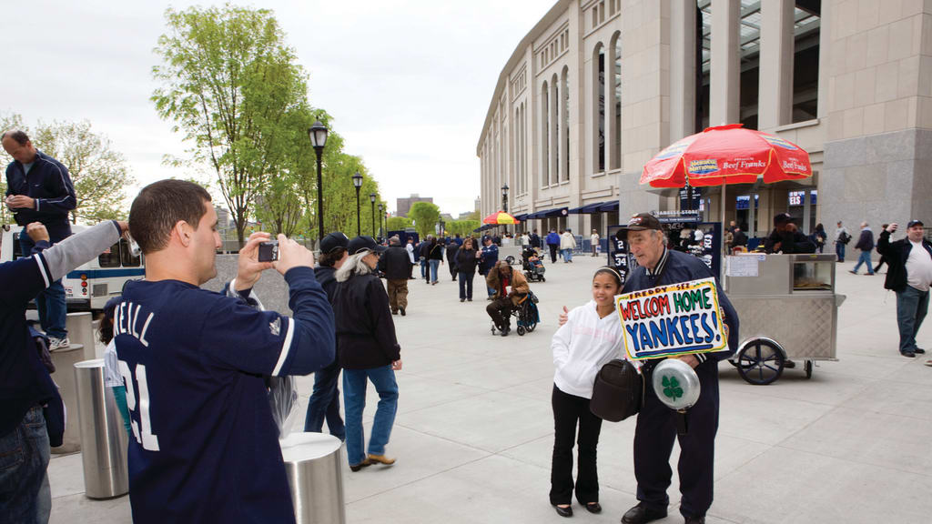 From the time he arrives at Yankee Stadium to the moment he leaves, no more than a few seconds pass without fans asking for a photo or smacking his pan. Fans yell his name as they pass on the concourses.