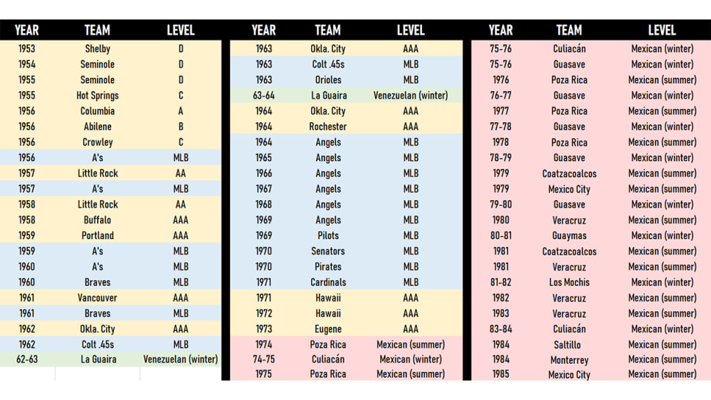 The most interesting player you've never heard of pitched in at least 33 consecutive professional seasons, from 1953 to 1985 -- and that's just what we can verify. He holds a share of the Major League record for most uniform numbers worn, and a share of the Angels' record for most losses in a season. He owns the Minor League record for most strikeouts. He's a member of the Mexican League Hall of Fame. This is all just barely scraping the surface of an incredible baseball life.