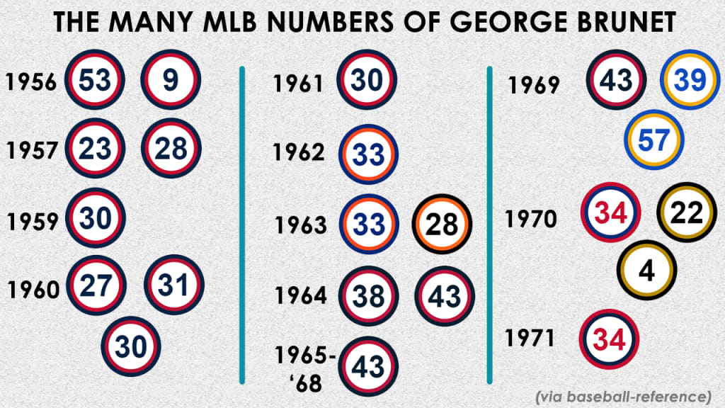 Over his 15 Major League seasons, Brunet got into 324 games for nine teams and wore -- deep breath -- 15 unique uniform numbers. (It's 18, if you consider that he wore 28, 30 and 34 for multiple teams with other numbers in between.)