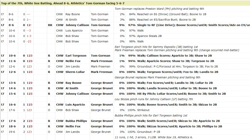 Four days later, the A's were down, 8-6, to the White Sox entering the seventh inning. That deficit was 19-6 at the end of the seventh inning ... a frame in which the White Sox had managed only one hit, a single. Three Kansas City pitchers had allowed 11 runs on one hit, three errors, a hit-by-pitch and 10 walks -- eight coming with the bases loaded.