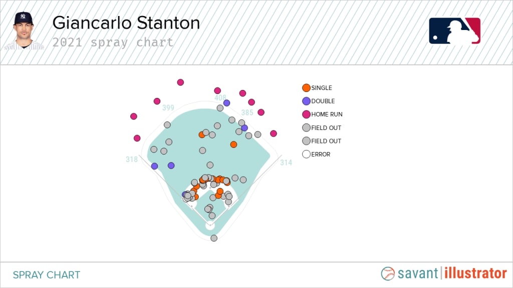 In 2020, Stanton pulled the ball 55.1% of the time, the highest such rate of his career. This year, he’s been hitting the ball more equally across the field, with a 31.8% pull rate, 43.5% of his batted balls going straightaway and 24.7% to the opposite field.