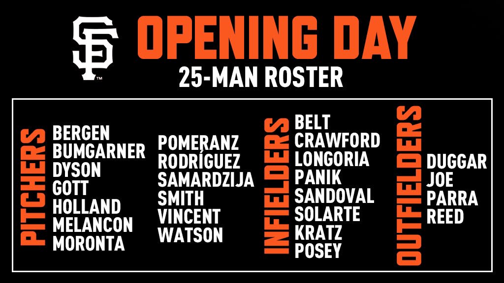 Starting pitcher (5): LHP Madison Bumgarner, LHP Derek Holland, RHP Dereck Rodriguez, RHP Jeff Samardzija, LHP Drew Pomeranz