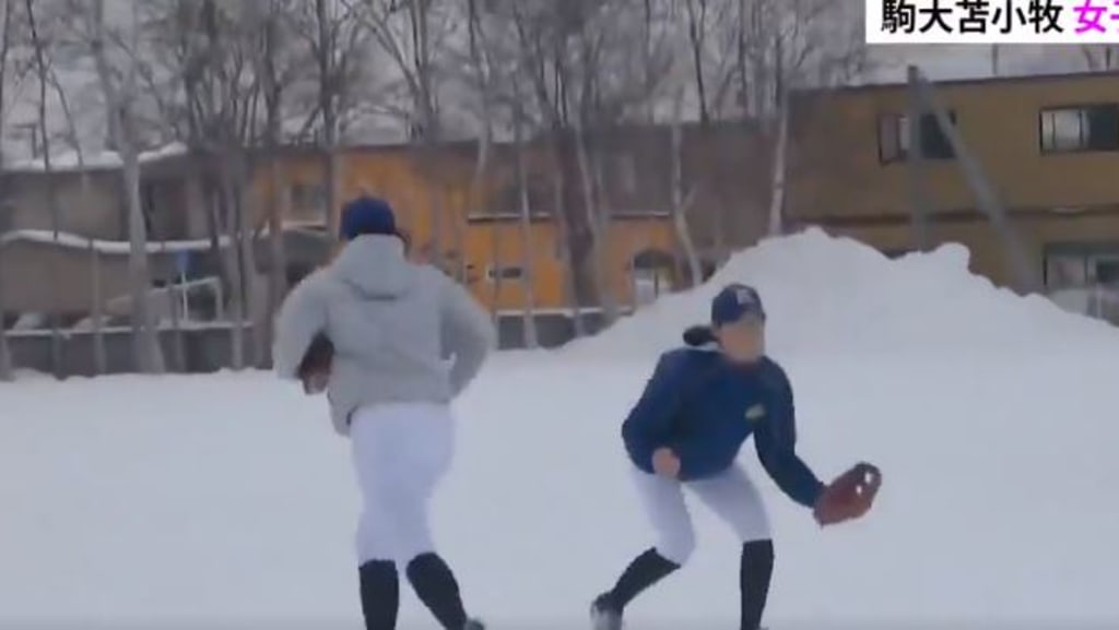 According to Reddit, this is the Komadai Tomakomai High School girls baseball team in Tomakomai, Hokkaido. It's the same high school Masahiro Tanaka starred for in the mid-2000s, so you know they mean business. The girls team was apparently formed last year and they'll practice by themselves or sometimes with the boys. And yes, they'll train in single-digit temperatures on snow-covered fields. Look at that pile of snow out in left. It's like a winter version of Tal's Hill.