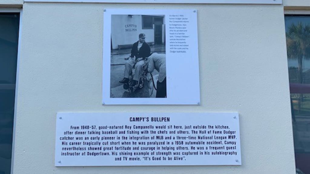 As players moved from field to field, former catcher Lenny Webster sat not far from a sign designating “Campy’s Bullpen,” where Dodgers Hall of Fame catcher Roy Campanella often sat during Spring Training from 1948 to '57, talking with players and workers just outside the kitchen.