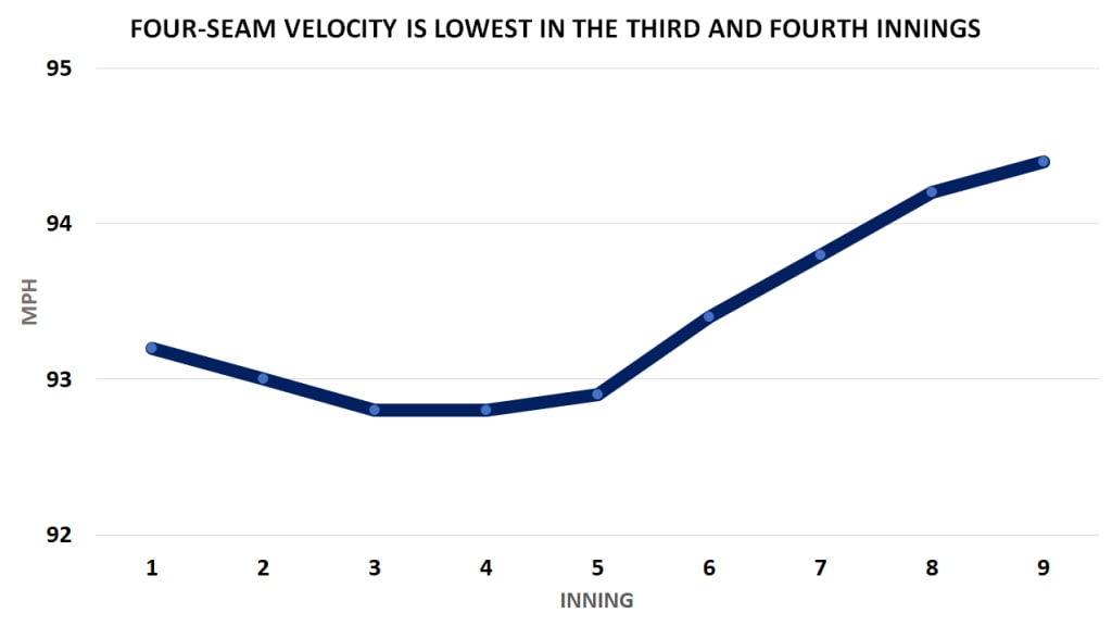 But this one is more about production, in a way that the first inning was not. Last year's third-inning OPS was .712, the 46th-highest in history. This year's third-inning OPS is .784, the second-highest in history. That might be in part about the fact that four-seam fastballs are the slowest in the third inning ...