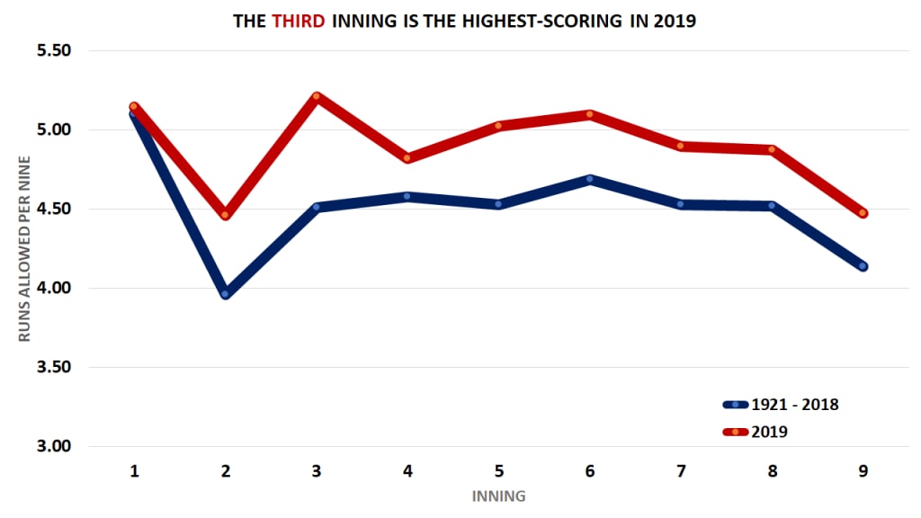 For the first time since 2009, and for only the fifth time in the last five decades, the first inning (and its 5.12 runs per nine innings) isn't the highest-scoring inning in 2019. Instead, it's the third inning (5.19 runs per nine) where we're seeing the most offense -- for just the second time on record, after 2001.