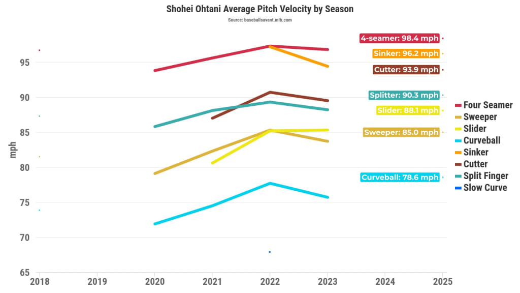 Ohtani's fastball velo actually reached a career high in 2025 -- both his average velocity, 98.4 mph, and his max velocity, 101.7 mph. At 98.4 mph, his four-seamer was over 1 1/2 mph harder than it was in 2023, before his arm injury, and it was top-five among starting pitchers.