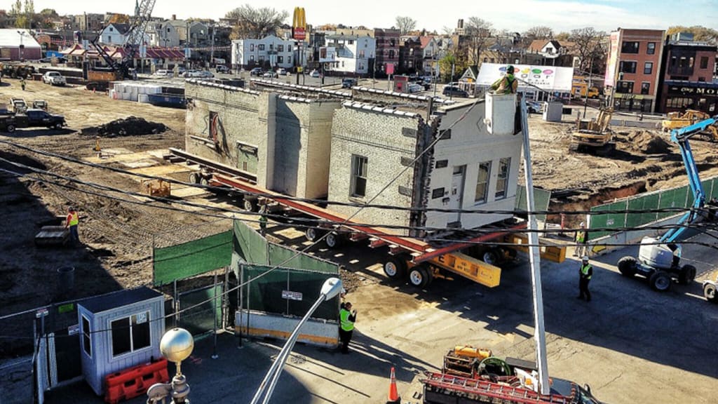 The 1060 Project team temporarily removed the historic caretaker's house from the northwest corner of Wrigley Field. The house now rests in the north end of Wrigley Field's Blue Lot for preservation work, which will allow the construction crews to complete modifications inside Wrigley Field's Gate K while excavating a new two-story basement level for the planned office building and plaza in the lots immediately adjacent to the ballpark. The caretaker's house is scheduled to return to its original location by Opening Day of 2015.