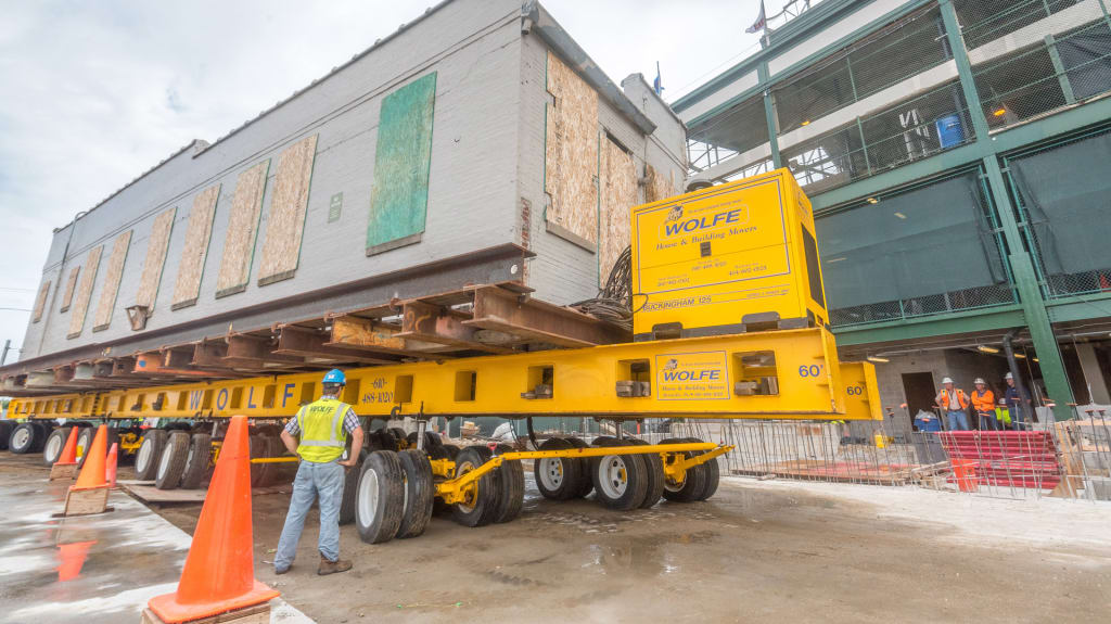 On Thursday, June 18, the 1060 Project team moved the historic caretaker's house from its temporary location in the Blue Lot back to its original location at the northwest corner of Wrigley Field. The caretaker's house was relocated to the Blue Lot in November 2014 to allow crews to work inside the ballpark while excavating the lot adjacent to Wrigley Field for the planned office building and plaza.
