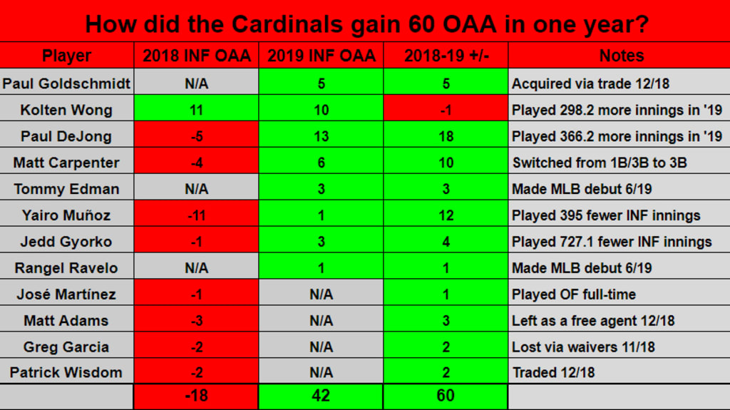 \n\n","providerName":"Twitter","providerUrl":"https://twitter.com","thumbnail_url":null,"type":"oembed","width":550,"contentType":"rich"},{"__typename":"Markdown","content":"**2) Observe the Goldy effect**\n\nWhen the Cardinals acquired Paul Goldschmidt from Arizona last offseason, his bat was the headline. But while the six-time All-Star first baseman didn’t have his typically excellent offensive season upon coming to St. Louis (113 OPS+), he certainly stabilized the defense. After a combination of Matt Carpenter, Martínez and Matt Adams took most of the first-base innings in 2018 and combined for -4 OAA, Goldschmidt played 95 percent of the Cardinals’ first-base innings in ‘19 and was worth 5 OAA.\n\nKeep in mind that one thing OAA does not currently account for -- but could in the future -- is a first baseman’s ability to receive throws, such as saving errors via scoops. Yet Goldschmidt likely excelled in that respect as well, something that could have helped the rest of the infield's OAA.\n\nAmong the Cardinals’ MLB-high 133 errors in 2018, 53 were throwing errors charged to second basemen, shortstops, third basemen and pitchers. The error is far from a perfect stat, and not all of those throws were necessarily directed to first base, but it’s worth noting that those four positions committed only 16 throwing errors for St. Louis in 2019. Goldschmidt almost certainly prevented more.","type":"text"},{"__typename":"Video","contentDate":"2019-09-14T00:36:45.659Z","preferredPlaybackScenarioURL({\"preferredPlaybacks\":\"mp4AvcPlayback\"})":"https://cuts.diamond.mlb.com/FORGE/2019/2019-09/13/1f1b9609-2a81dd05-07facbae-CSVM-DIAMONDTMP-asset_1280x720_59_4000K.mp4","type":"video","description":"Paul Goldschmidt races into the first-base foul territory and makes a tough running catch for the out in the 1st inning","displayAsVideoGif":false,"duration":"00:00:44","slug":"goldy-s-tough-running-catch","tags":[{"__typename":"GameTag"},{"__typename":"TeamTag","slug":"teamid-138","title":"St. Louis Cardinals","team":{"__ref":"Team:138"},"type":"team"},{"__typename":"PersonTag","slug":"playerid-502671","title":"Paul Goldschmidt","person":{"__ref":"Person:502671"},"type":"player"},{"__typename":"InternalTag","slug":"season-2019","title":"Season 2019","type":"season"},{"__typename":"TaxonomyTag","slug":"highlight","title":"highlight","type":"taxonomy"},{"__typename":"TaxonomyTag","slug":"in-game-highlight","title":"in-game highlight","type":"taxonomy"},{"__typename":"TaxonomyTag","slug":"defense","title":"defense","type":"taxonomy"},{"__typename":"TaxonomyTag","slug":"international-feed","title":"International Partner feed","type":"taxonomy"},{"__typename":"TaxonomyTag","slug":"eclat-feed","title":"Eclat feed","type":"taxonomy"}],"thumbnail":{"__typename":"Thumbnail","templateUrl":"https://img.mlbstatic.com/mlb-images/image/private/{formatInstructions}/mlb/xylq5bxxtlaqbm0t9x9f"},"title":"Goldy's tough running catch","relativeSiteUrl":"/video/goldy-s-tough-running-catch"},{"__typename":"Markdown","content":"**3) Stay healthy and stable**\n\nThings were a lot simpler for the St. Louis infield in 2019. DeJong and Goldschmidt both played about 95 percent of the innings at their positions and shined. Kolten Wong played 83 percent of the innings at second base and won a Gold Glove. Between those three, the Cardinals had two of the best infield combos in MLB.","type":"text"},{"__typename":"OEmbed","html":"