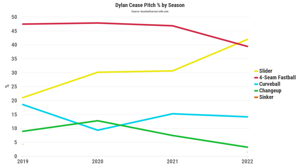\n","providerName":"Twitter","providerUrl":"https://twitter.com","thumbnail_url":null,"type":"oembed","width":550,"contentType":"rich"},{"__typename":"Markdown","content":"That’s still true today, where it’s No. 3 among all pitchers with 100 curves, and No. 1 among starters. Like the slider, it’s gained velocity as this season has progressed, going from 78.8 mph in April to a career-high 82.2 mph in August. Still, even though it's only 5 mph slower than his slider, it drops 24 inches -- yes, two feet -- more. Talk about changing the eye level.","type":"text"},{"__typename":"Markdown","content":"### **4\\. The changeup**\n\nClearly his fourth pitch – used just 3% of the time – we won’t spend a great deal of time on this weapon, one that might be evolving into more of a splitter, other than to point out that it’s going the opposite way, velocity-wise, of his two breaking balls. This one was 83.1 mph as a rookie, and it’s down to 77.7 mph now.\n\nRemember that Cease throws a 96.9 mph four-seamer, and that most changeups work best playing off the four-seamer, and now he’s got a 19.2 mph velocity gap between the two. It’s the largest gap, by kind of a lot, of any pitcher in baseball. (Only one other pitcher, Cleveland reliever Eli Morgan, has even a 16 mph difference.)\n\nWhen it works right, when he can make the changeup look like the fastball, you can see just how silly it makes hitters look, like then-Royal Andrew Benintendi earlier this season. It helps, too, that it breaks four times as much as it did when he was a rookie.","type":"text"},{"__typename":"OEmbed","html":"