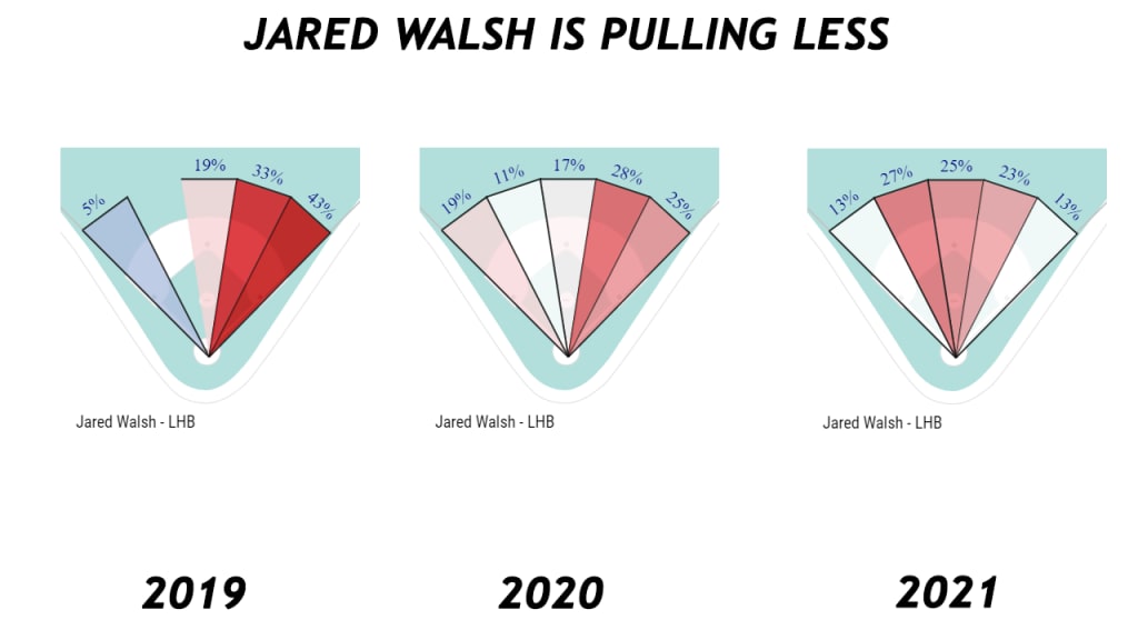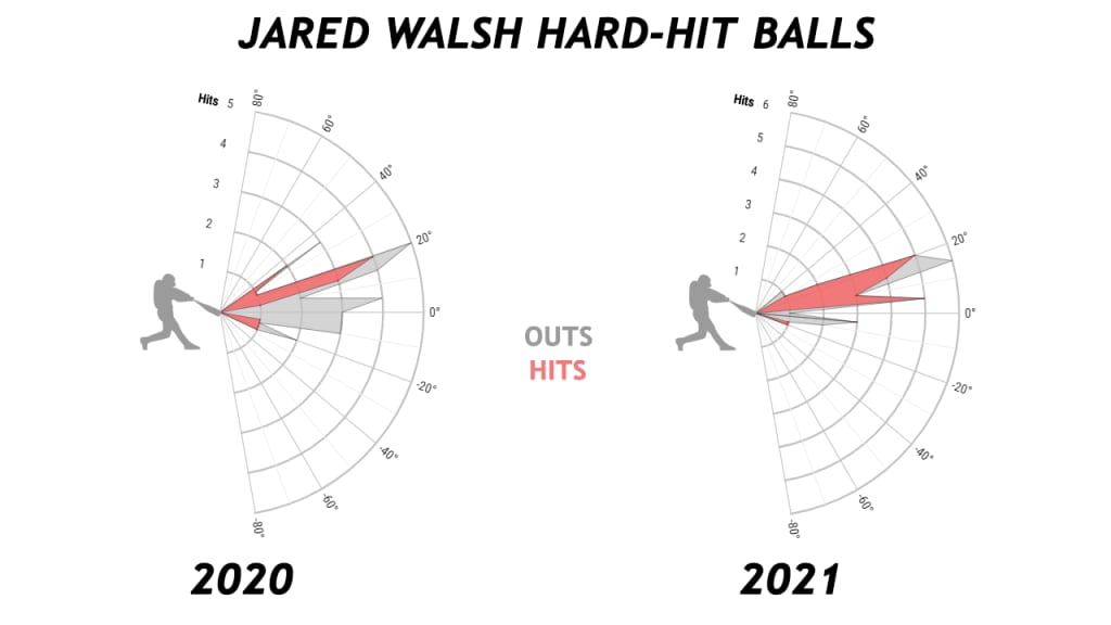 \n","providerName":"Twitter","providerUrl":"https://twitter.com","thumbnail_url":null,"type":"oembed","width":550,"contentType":"rich"},{"__typename":"Markdown","content":"… and maybe, now, Walsh ought to be one of those Big Names too?\n\nThe first thing to note, probably, is that his 2021 performance isn’t completely out of nowhere; he did, after all, hit .293/.324/.646 (.971 OPS, or 153 OPS+) in 2020, and while that came in a mere 108 plate appearances, it was enough to earn him a spot on our March list of [2021 breakout candidates](https://www.mlb.com/news/breakout-hitters-for-2021-to-watch). You might wonder if a 153 OPS+ didn’t _already_ count as a breakout, and maybe it did, but also he didn’t get his first hit of last season until Sept. 2, so it felt like he still had much to prove.\n\nBesides, when we looked into Walsh's 2020 line, we saw that, unlike fellow short-2020-season-standout Willi Castro (who had a 150 OPS+ last year and has a 58 OPS+ this year), there was a lot to like about what was driving it.\n\n“In 2020,” [we wrote](https://www.mlb.com/news/breakout-hitters-for-2021-to-watch), “here’s the list of hitters (minimum of 100 plate appearances) who had a [barrel](http://m.mlb.com/glossary/statcast/barrel) rate above 10% and a strikeout rate below 15%. There were only six. You know the other five:\n\nFreddie Freeman \nManny Machado \nKyle Seager \nJuan Soto \nJustin Turner\n\n… and Jared Walsh.”\n\nSo! There’s a nice list to be on. A barrel is the perfect combination of exit velocity and launch angle -- basically, a hard-hit ball hit in the air, [on which the sport hit](https://baseballsavant.mlb.com/statcast_search?hfPT=&hfAB=&hfGT=R%7C&hfPR=&hfZ=&stadium=&hfBBL=&hfNewZones=&hfPull=&hfC=&hfSea=2020%7C&hfSit=&player_type=pitcher&hfOuts=&opponent=&pitcher_throws=&batter_stands=&hfSA=6%7C&game_date_gt=&game_date_lt=&hfInfield=&team=&position=&hfOutfield=&hfRO=&home_road=&hfFlag=&hfBBT=&metric_1=&hfInn=&min_pitches=0&min_results=0&group_by=league&sort_col=ba&player_event_sort=api_p_release_speed&sort_order=desc&min_pas=0&chk_stats_abs=on&chk_stats_hits=on&chk_stats_ba=on&chk_stats_slg=on#results) .797 with a slugging percentage near 2.800 last year -- and when you pair that with a low strikeout rate, well, that’s how you end up on a list with Freeman, Machado and Soto.\n\nThat all earned Walsh the [starting first-base job](https://www.mlb.com/news/jared-walsh-set-for-full-time-first-base-duties-in-2021) heading into the season, though he ended up spending most of April playing right field after [Dexter Fowler injured his knee](https://www.mlb.com/news/dexter-fowler-has-torn-left-acl). Back at first base with Taylor Ward now starting in right, Walsh has, on a rate basis, improved his line over that 2020 mark; after all, a 182 OPS+ is better than the 153 he had last season. Put them together, and since the start of last season, [only Trout and Soto have better lines](https://www.fangraphs.com/leaders/splits-leaderboards?splitArr=&splitArrPitch=&position=B&autoPt=true&splitTeams=false&statType=player&statgroup=2&startDate=2020-03-01&endDate=2021-11-01&players=&filter=&groupBy=career&sort=16,1) than Walsh does, which continues to just be a wild statement.\n\nThat’s rarefied air. So, since we liked the underlying numbers we saw last year, he must be doing that same thing again, right? Well, no. Not exactly. Not really at all.","type":"text"},{"__typename":"Video","contentDate":"2021-05-11T04:14:31.957Z","preferredPlaybackScenarioURL({\"preferredPlaybacks\":\"mp4AvcPlayback\"})":"https://mlb-cuts-diamond.mlb.com/FORGE/2021/2021-05/10/fa080be9-3df93408-8c4178bc-csvm-diamondx64-asset_1280x720_59_4000K.mp4","type":"video","description":"Jared Walsh goes 4-for-4 and plates a pair of runs to lead the Angels to a 5-4 win over the Astros ","displayAsVideoGif":false,"duration":"00:01:26","slug":"jared-walsh-goes-4-for-4","tags":[{"__typename":"GameTag"},{"__typename":"TeamTag","slug":"teamid-108","title":"Los Angeles Angels","team":{"__ref":"Team:108"},"type":"team"},{"__typename":"PersonTag","slug":"playerid-665120","title":"Jared Walsh","person":{"__ref":"Person:665120"},"type":"player"},{"__typename":"TaxonomyTag","slug":"hitting","title":"hitting","type":"taxonomy"},{"__typename":"TaxonomyTag","slug":"highlight-reel-offense","title":"highlight reel offense","type":"taxonomy"},{"__typename":"TaxonomyTag","slug":"in-game-highlight","title":"in-game highlight","type":"taxonomy"},{"__typename":"TaxonomyTag","slug":"highlight","title":"highlight","type":"taxonomy"},{"__typename":"TaxonomyTag","slug":"carry-the-freight","title":"Carry the Freight","type":"taxonomy"},{"__typename":"TaxonomyTag","slug":"eclat-feed","title":"Eclat feed","type":"taxonomy"},{"__typename":"TaxonomyTag","slug":"international-feed","title":"International Partner feed","type":"taxonomy"},{"__typename":"TaxonomyTag","slug":"yahoo-fantasy","title":"Yahoo Fantasy","type":"taxonomy"},{"__typename":"TaxonomyTag","slug":"1-yahoo-fantasy-feed","title":"1-Yahoo Fantasy Feed","type":"taxonomy"}],"thumbnail":{"__typename":"Thumbnail","templateUrl":"https://img.mlbstatic.com/mlb-images/image/private/{formatInstructions}/mlb/kwyrekqwx1iqdcwzqa6r"},"title":"Jared Walsh goes 4-for-4 ","relativeSiteUrl":"/video/jared-walsh-goes-4-for-4"},{"__typename":"Markdown","content":"### **What's different in 2021**\n\nWalsh is, again, performing better than he did last year, so allow us to surprise you with the fact that his hard-hit rate is _down_ (from 39% to 36%) and his strikeout rate is _up_ (from 14% to 21%) and his barrel rate is about the _same_ (a similar 12%) and now, really, you’re very confused.\n\nThe first, and most obvious, thing to look at is the simple fact that he’s getting on base more often. Walsh, last season, had a relatively unimpressive .324 on-base percentage, generating most of his value from his power. This year, that’s up to a very strong .426 OBP, which is both [the fourth best](h