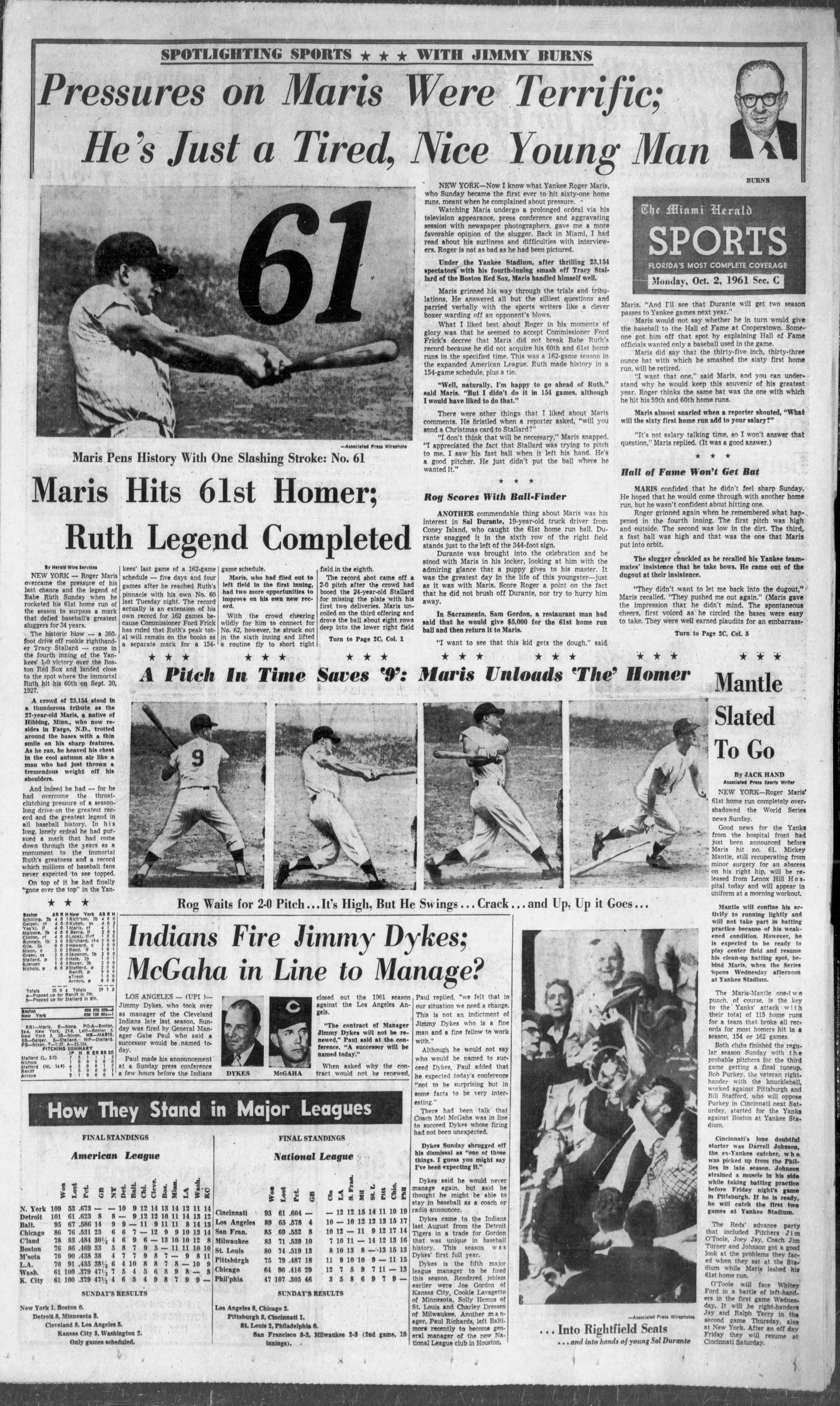 “... He had overcome the throat-clutching pressure of a season-long drive on the greatest record and the greatest legend in all baseball history,” read the coverage in The Herald. “In his long, lonely ordeal he had pursued a mark that had come down through the years as a monument to the immortal Ruth’s greatness and a record which millions of baseball fans never expected to see topped.”
