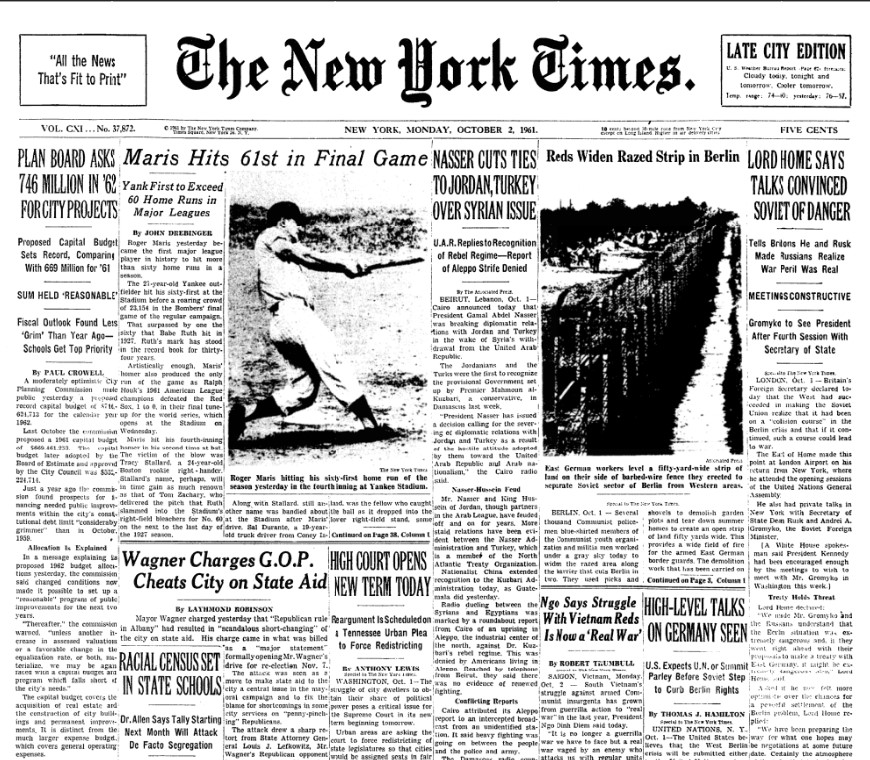"Maris hits 61st in final game" — The New York Times