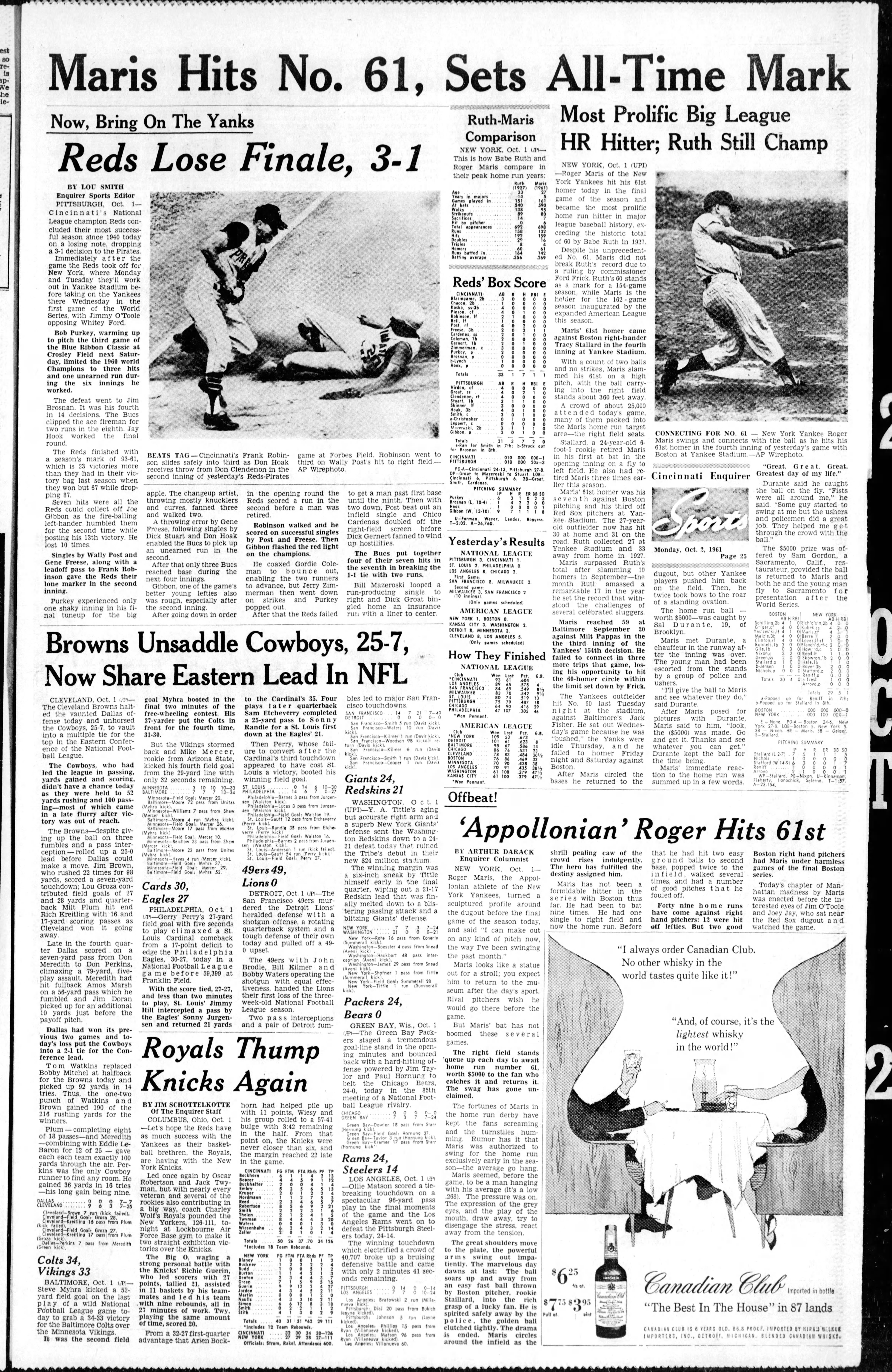 “Despite his unprecedented No. 61, Maris did not break Ruth’s record due to a ruling by commissioner Ford Frick,” a wire service report in the Enquirer read. “Ruth’s 60 stands as a mark for a 154-game season, while Maris is the holder of the 162-game season inaugurated by the expanded American League this season.”