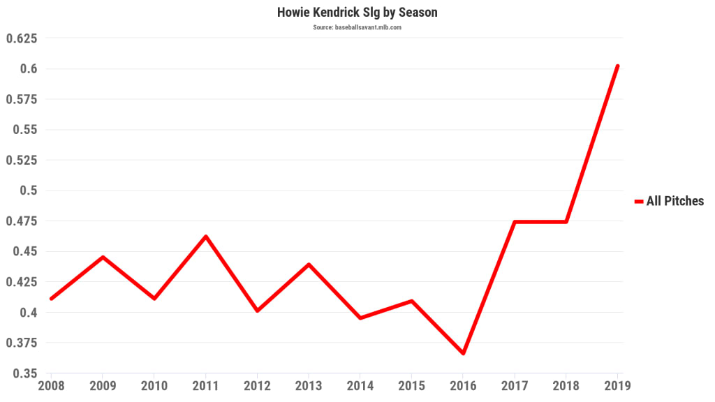 You also get a slugging percentage chart that looks like this, and makes it clear that this isn't just a suddenly-happening-in-2019 thing. It's been a few years coming. Over the last three years, Kendrick's .317/.364/.510 line is 39th of the 339 players with at least 500 plate appearances. He's been a new hitter, even if it's taken a while to notice.