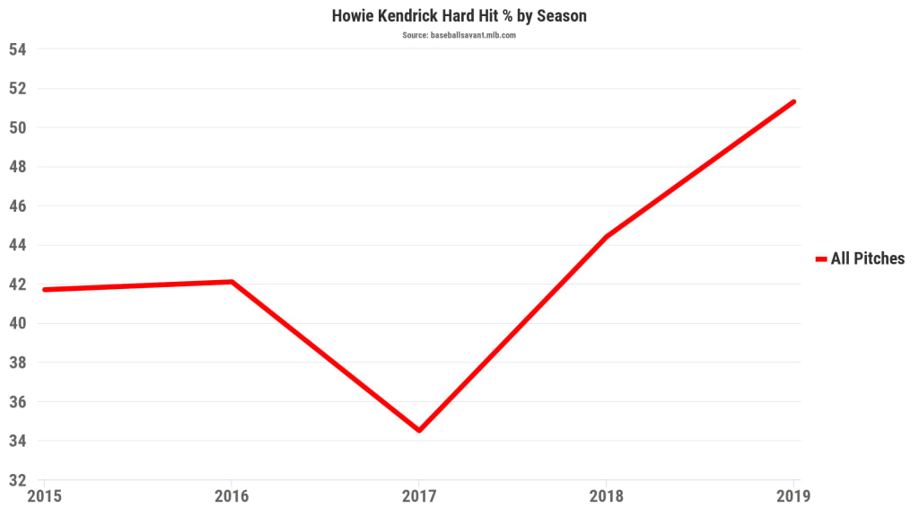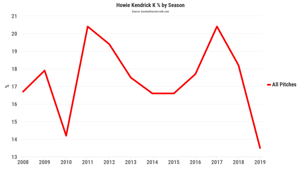 Kendrick was always decent enough at making contact; as an Angel, his 17.2% strikeout rate was slightly better than the 18.5% Major League average during that time. But in 2017, he tied his career high at 20.4%. That dropped a bit to 18.1% in 2018, then down again to 13.5% this year. That's among the 25 lowest in baseball, among those with as many plate appearances as he has, and when he swings in the zone, he makes contact 94.8% of the time -- higher than all but three other players.