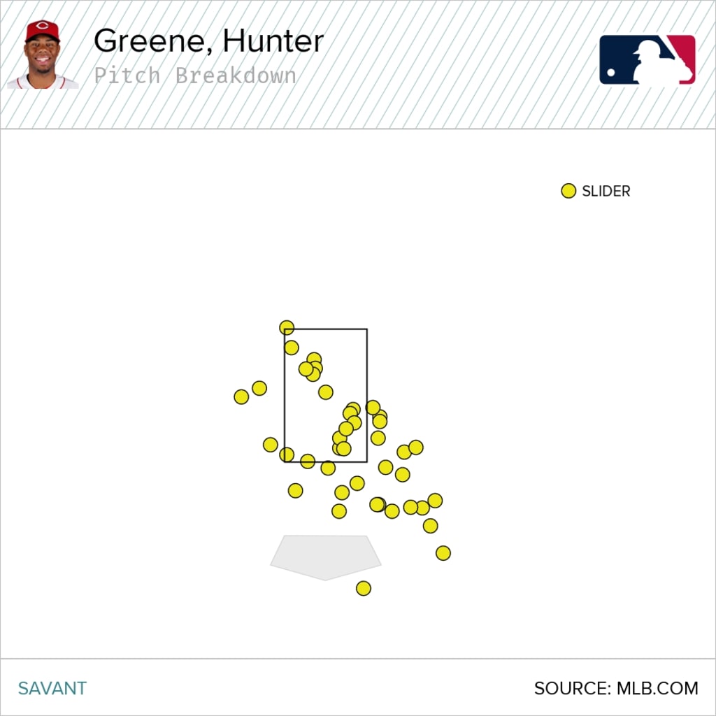 \n","providerName":"Twitter","providerUrl":"https://twitter.com","thumbnail_url":null,"type":"oembed","width":550,"contentType":"rich"},{"__typename":"Markdown","content":"That pitch tunnel requires two components. You know all about Greene's record-setting fastball already. Let's take a look at the other half.\n\nHere's a breakdown of Greene's slider as the Reds' No. 1 prospect, per MLB Pipeline, makes his third start against the Cardinals on Friday, which will be broadcast exclusively for free on Apple TV+ as part of its Friday Night Baseball package. For more information about how to access \"Friday Night Baseball\" on Apple TV+, visit the Apple Knowledge Base.","type":"text"},{"__typename":"Markdown","content":"**The early numbers are excellent**\n\nAs overpowering as Greene is, he's given up nine hits, including three home runs, through two career starts. All nine of those hits are off his fastball.\n\nOpponents are 0-for-11 against Greene's slider. They've struck out five times in those 11 at-bats, and whiffed on 47% of their swings against it. Greene is one of five starting pitchers holding opponents hitless on their slider through at least 10 plate appearances this season.\n\n**SP with 0 hits allowed on sliders in 10+ PA in 2022** \nMax Scherzer, Mets: 0-for-12, 6 K \nChris Bassitt, Mets: 0-for-12, 7 K \nHunter Greene, Reds: 0-for-11, 5 K \nTylor Megill, Mets: 0-for-10, 5 K \nChad Kuhl, Rockies: 0-for-10, 7 K","type":"text"},{"__typename":"Markdown","content":"**It can strike you out all on its own**\n\nWho needs a 100 mph fastball? In the second inning of his first start against the Braves, Greene faced Adam Duvall and did this.","type":"text"},{"__typename":"OEmbed","html":"