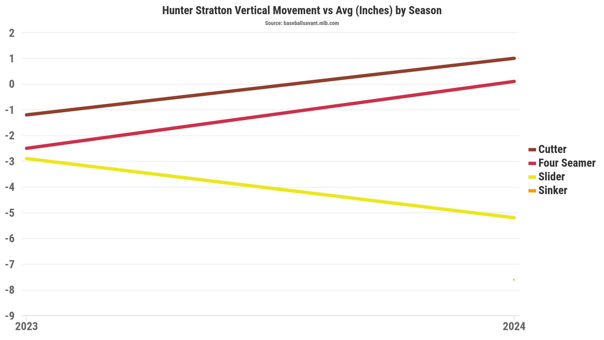 The cutter is the median pitch. It gets above-average horizontal movement (0.5 inches more), allowing Stratton to throw backdoor cutters to left-handed hitters or force right-handers to guess if the pitch darting outside is a cutter that will catch the zone or a slider that will keep falling. It also gets 21.4 inches of vertical movement -- one more than average -- which can create awkward swings for hitters trying to identify how much cut that 90-something-mph offering is going to have, all while it is also giving the illusion of rising.