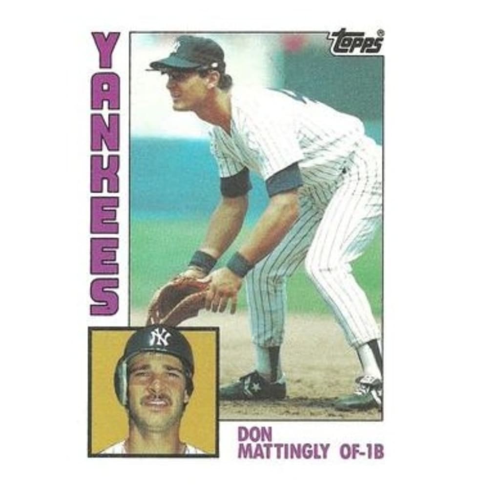 Mattingly rose to prominence as baseball-card collecting was skyrocketing in popularity, and his rookie cards from 1984 were a must-have for collectors during that time. The '84 Topps design is easily distinguishable -- Mattingly's card features "Yankees" rendered in purple block lettering and has an inset headshot showing the first baseman staring into the distance in front of a yellow background. See the card >