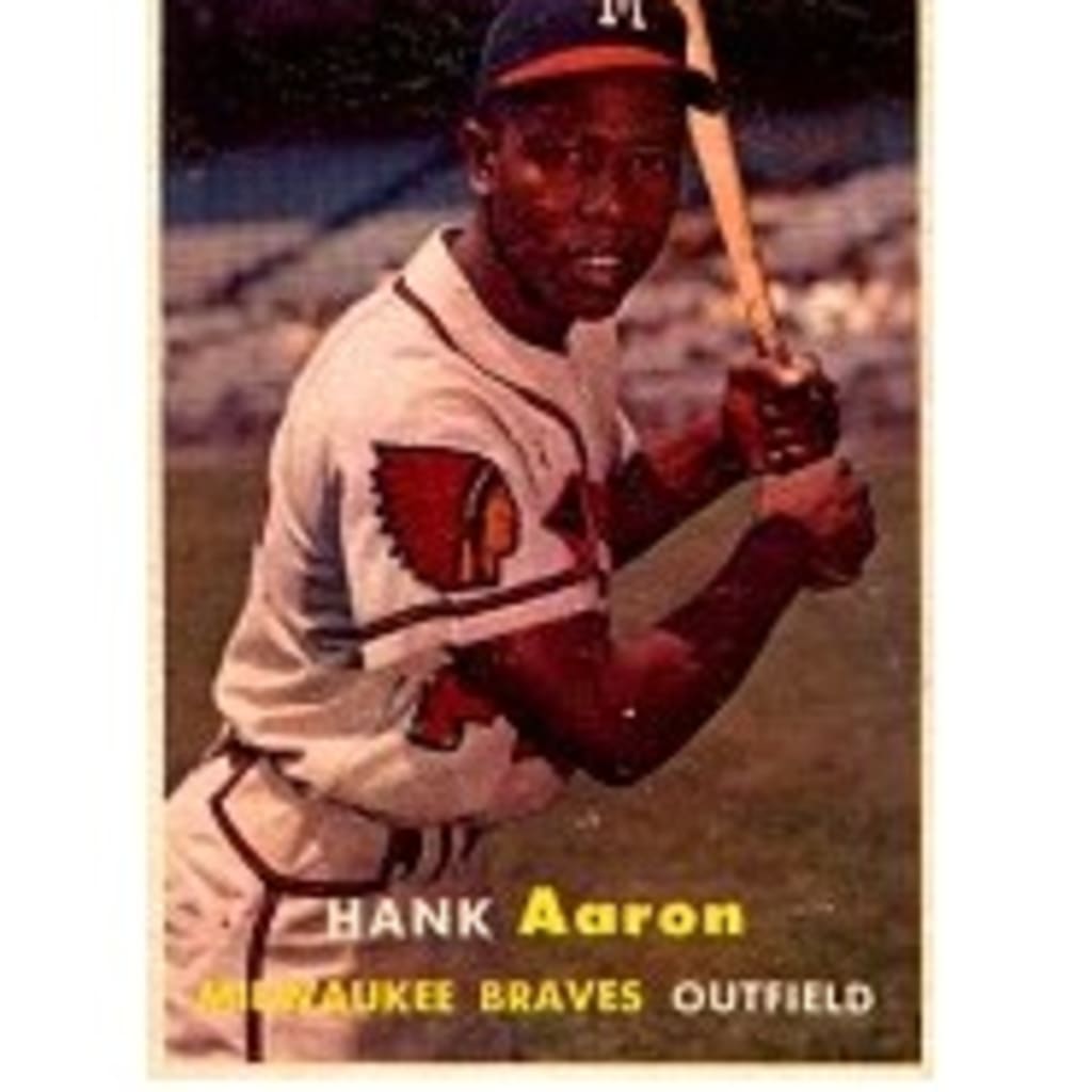 Aaron's 1957 Topps card shows a 23-year-old who still had 689 career home runs ahead of him. Strangely, the image is reversed, making Aaron seem like a left-handed hitter. See the card >