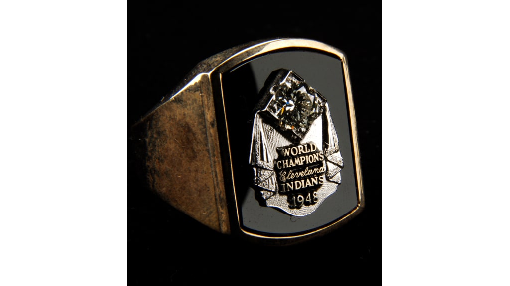 Fun facts: Behind the pitching of Bob Lemon, the Indians earned this World Series championship ring after they defeated the Braves in six games in the 1948 Fall Classic. The dramatic, diamond-topped theatrical curtain set in onyx distinguishes this ring from others, before or since.