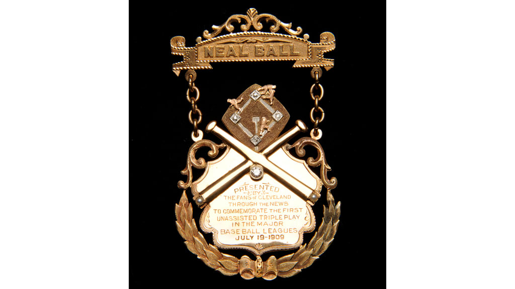 Fun facts: On July 19, 1909, Cleveland shortstop Neal Ball completed the American League’s first unassisted triple play, commemorated by this diamond and pearl medal. Ball's play happened so abruptly that the fans, at first, did not understand what had happened. However, once the visiting Red Sox began taking the field, the crowd erupted with cheers.