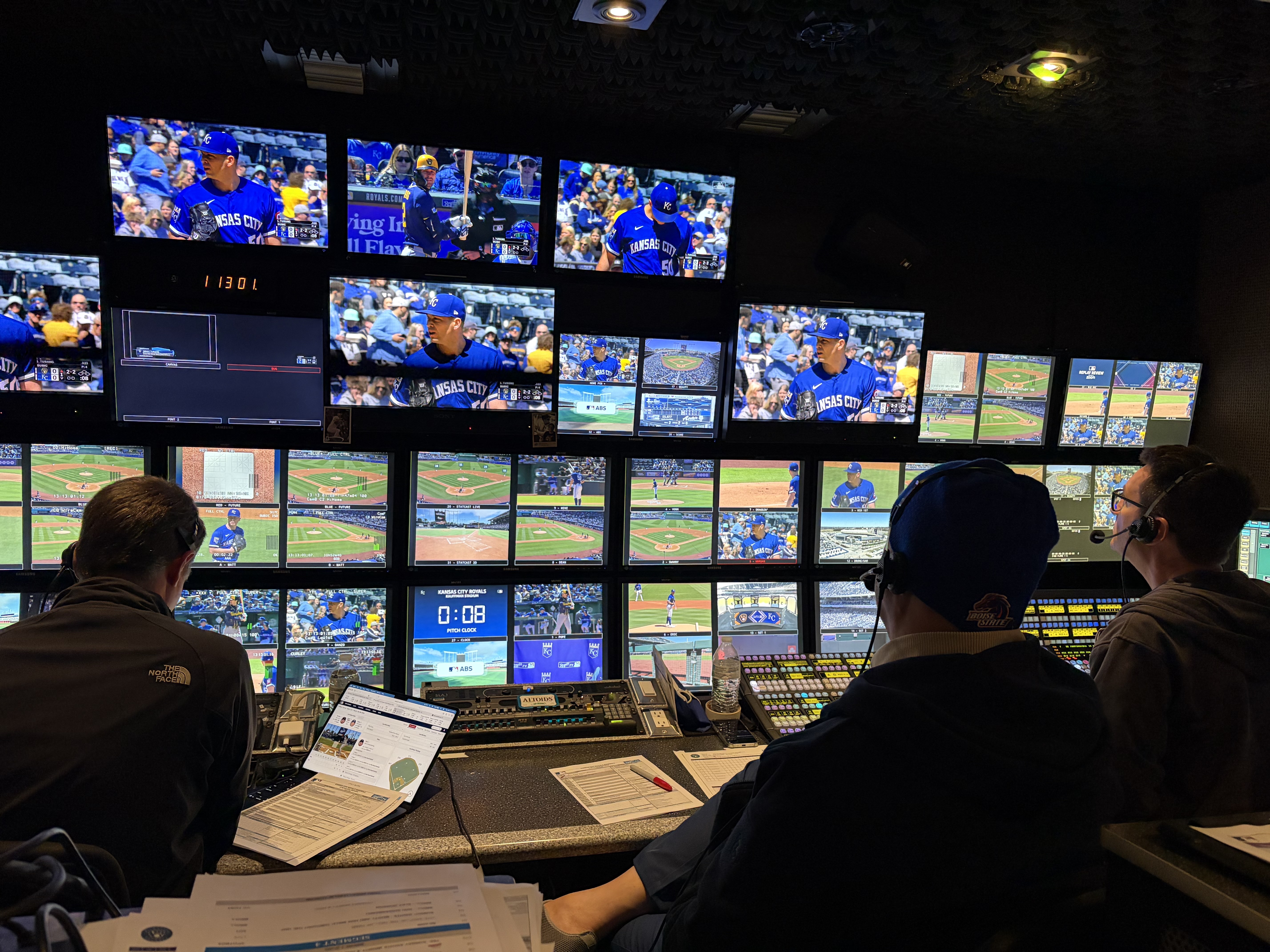 All the work to show those views happens in the TV truck, positioned in a fenced section of the parking lot at Kauffman Stadium. There are 34 people on the broadcast crew, including on-air talent. Sixteen people work in the truck at home with a smaller crew that travels on road trips.