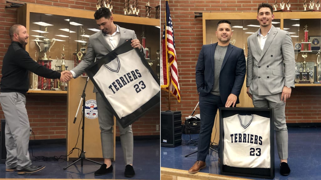 The 23-year-old was home at Redlands High School in Southern California over the weekend, where he became the first player from the school to have his uniform number retired in baseball. Nottingham starred in baseball and football for the Terriers, and was so accomplished on the football field that he was offered a scholarship to play linebacker and tight end at the University of Arizona.