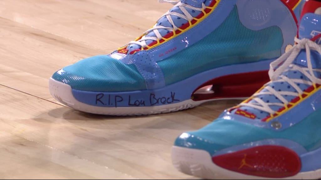 Tatum was rocking Jordan 34s in 1970s Cardinals colorways -- powder blue, red, and yellow -- and wrote "RIP Lou Brock" on the side.