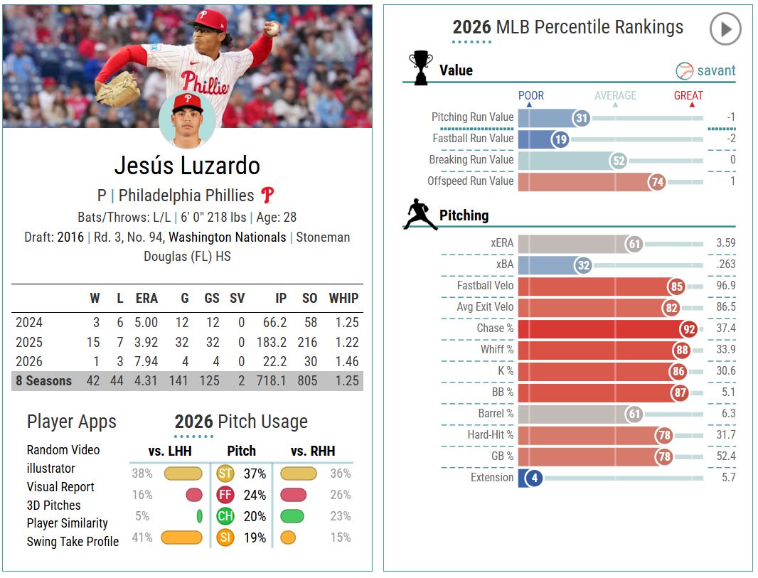 Of course, patience isn’t really a luxury the Phillies can afford right now, and Luzardo’s strong underlying metrics won’t offer much comfort if the results don’t begin to improve soon. Philadelphia needs that to start tonight against the Cubs.